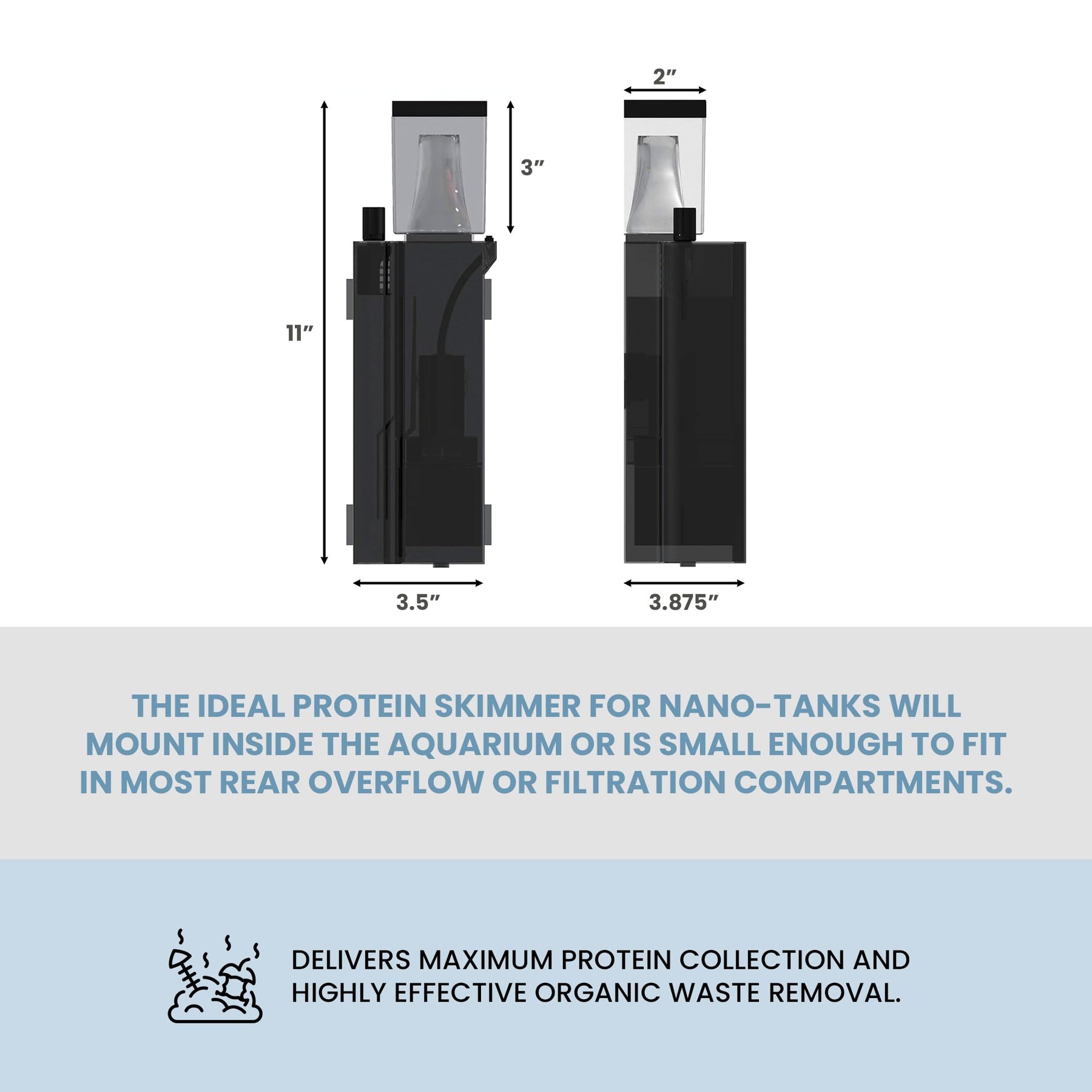 - COMPACT FOR NANO TANKS: This compact protein skimmer for nano-tanks measures only 3-1/2 x 3-5/8 x 10-5/8 inches. It’s great for small aquariums and mini-reef aquariums. It mounts to fit inside most rear overflow or filtration compartments with a minimum size of 4 x 4 inches