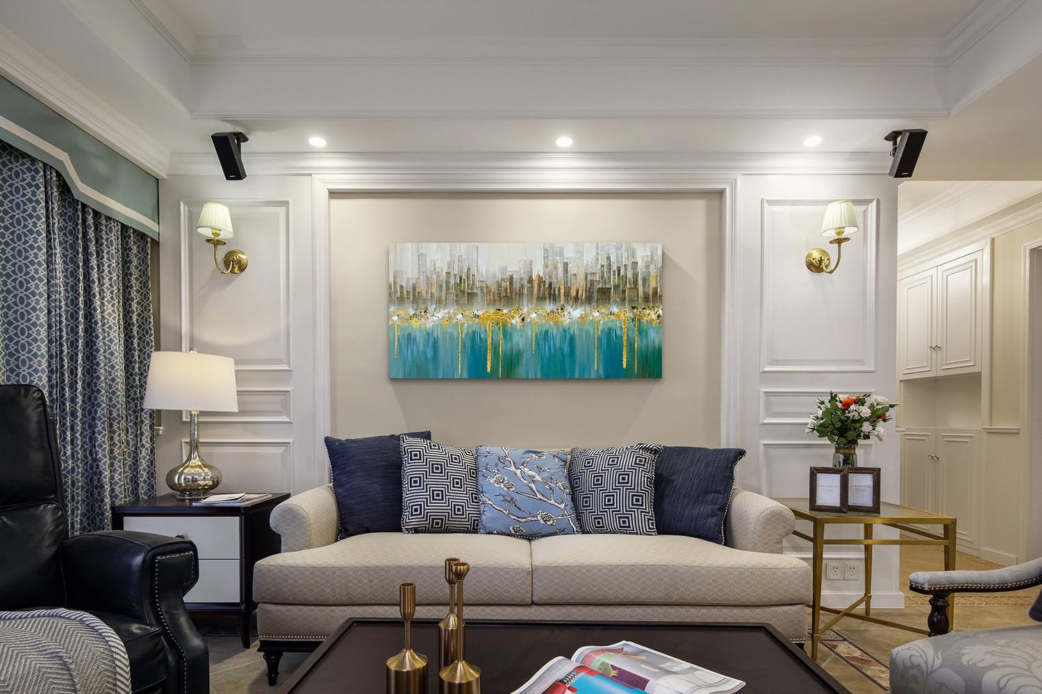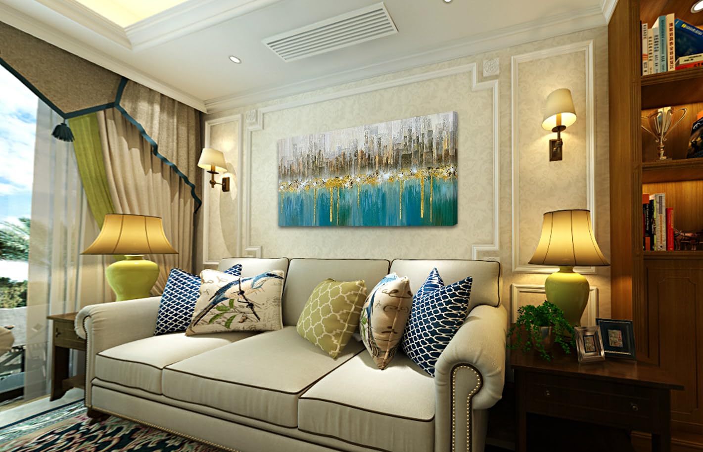 - Original Posters & Prints – Teal Abstract Cityscape Canvas Wall Art Modern Skyline Gold Textured Painting, Grey Buildings Large Size 40x20 Picture Turquoise Artwork Framed for Living Room Bedroom Home Office Wall Decor by Ardemy