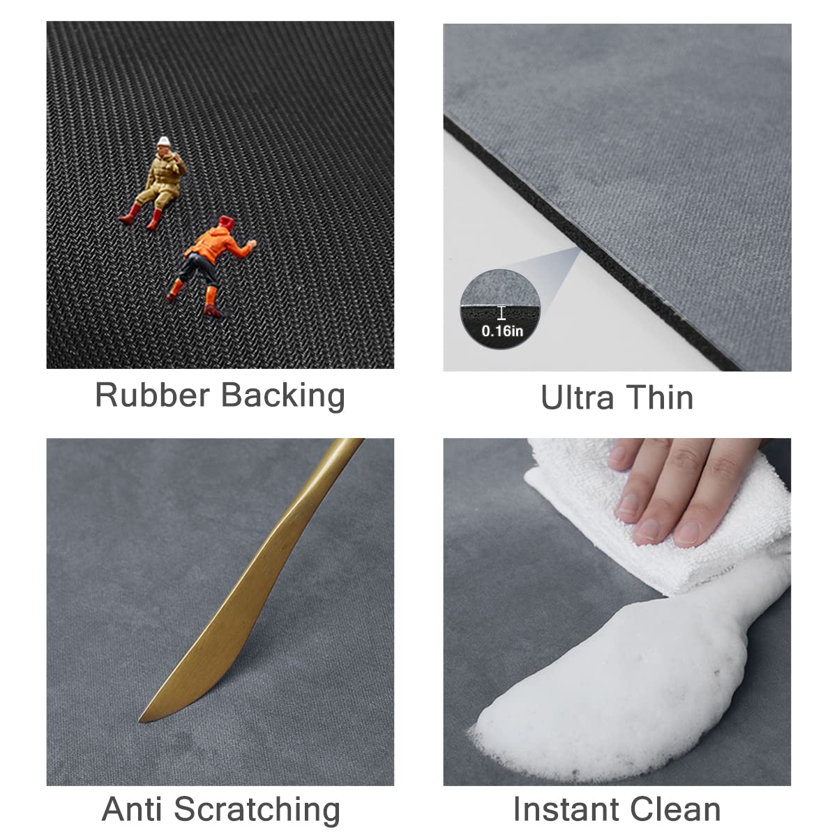 - Floor Mat StructureThe surface is artificial suede to increase comfort.The second layer is a soft asbestos layer with super absorbency and quick drying.The third layer is a sponge layer,good cushioning performance can reduce footsteps and avoid affecting family rest. At the same time, it plays a certain cushioning role when accidentally dropping items. The fourth layer is a special durable rubber material to increase stability and prevent falls