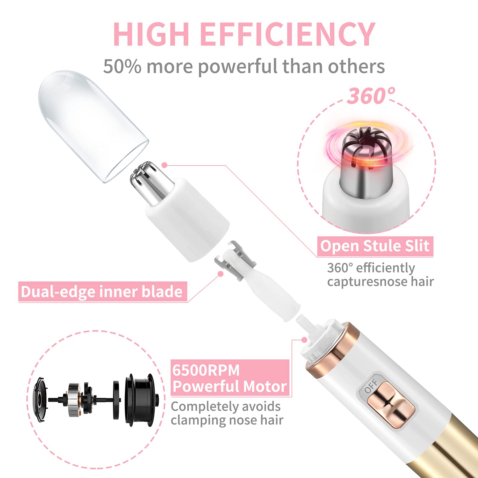 - POWERFUL AND FASTERThis nose hair trimmer nasal clipper features high quality 6500 RPM powerful motor and dual-dual-edge blade, 50 % more powerful than others, which precisely remove the hairs quickly without painful and unpleasant pulling.