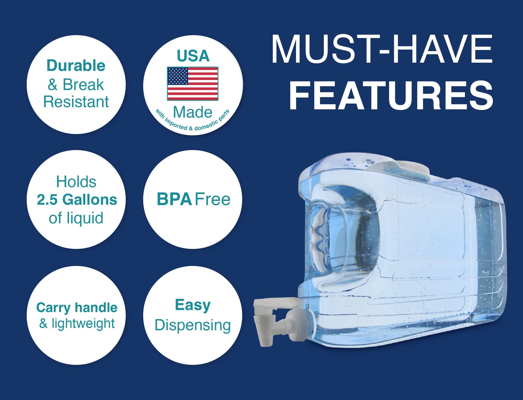 - Must-Have Features - Our food-safe BPA free plastic beverage dispenser is Made in the USA with domestic & imported parts, reusable, stain-resistant, durable and break resistant. Ideal for filling with water, iced tea, milk, juice or lemonade.