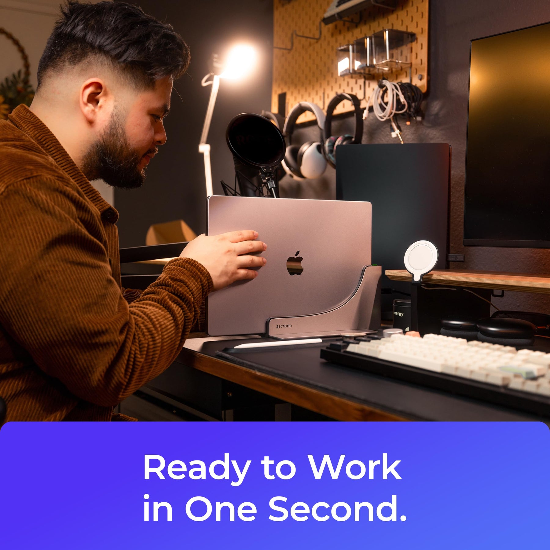 - SEAMLESS DESKTOP CONVERSION - Elevate your MacBook Pro’s experience into a fully functional desktop setup with the Ascrono Vertical Docking Station. Slide in your MacBook for instant device connectivity, indicated by a green light and instantly switch between on-the-go efficiency and desktop productivity.