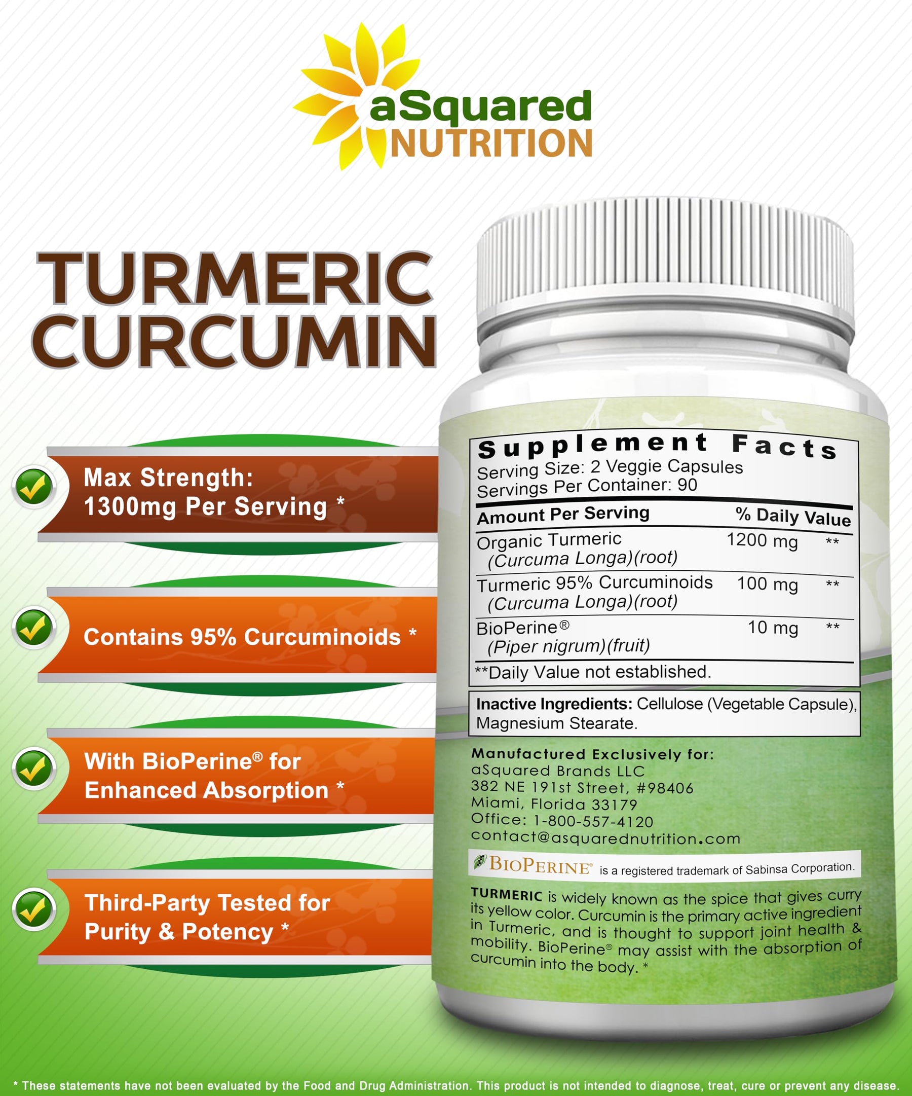 - BEST VALUE AVAILABLE: You receive 180 maximum strength capsules for a full 90 day supply. Our potent 1300mg formula delivers more value than the biggest names touting only 900mg or 1000mg of Turmeric Curcumin per serving. Also try aSquared Nutrition's Resveratrol, CoQ10 400mg or our All Natural Ceylon Cinnamon (100% All Natural). *