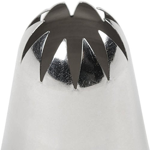 Create deeply-grooved icing patterns on your cakes, cupcakes, pies, and more with this Ateco 849 11/16 closed star #28 pastry tube. Made of durable stainless steel, this tube is rust-resistant and designed to withstand repeated use without bending out of shape. Featuring a closed star tip, you can create shells, stars, fleur-de-lis, rosettes, and flowers. The closed star design produces a defined texture for eye-catching bakery decorations. Plus, its large size is perfect for icing confectionary creations quickly and efficiently. Using the right sized pastry tube for the job will enhance your presentation to draw patrons' attention to your display cases and plated desserts.