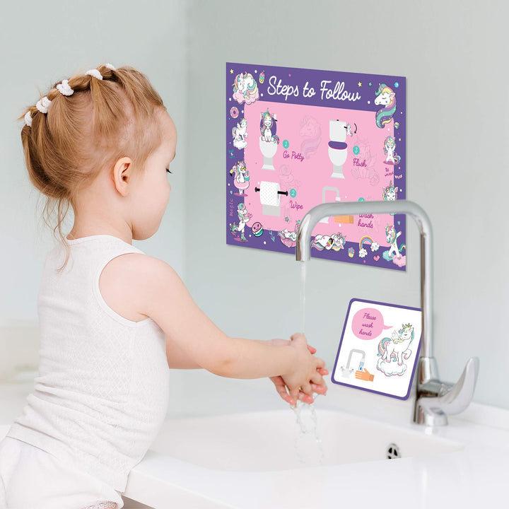 There are 3 cards included in your potty kit. One is to be placed right by the toilet paper dispenser to show how much of the toilet paper to be used. One is to be placed by the toilet flush to remind kids to flush the toilet and the other is for next to the washbasin to remind them to wash their hands.