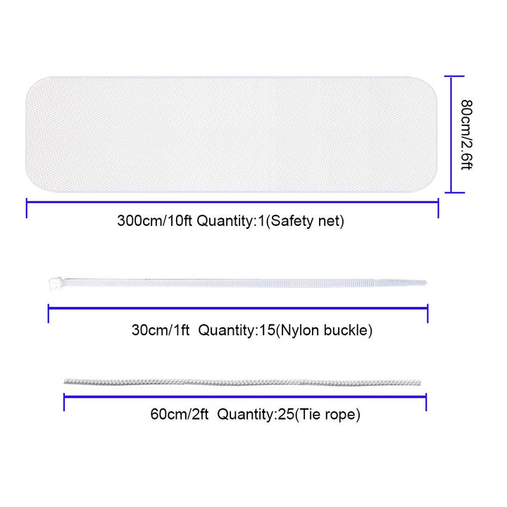- Dimension: The Safety net is 10ft x2.6ft (L*H). If the railing is long, you can connect two or more net using the same installation way. If the railing is short, you can fold the net to install it.