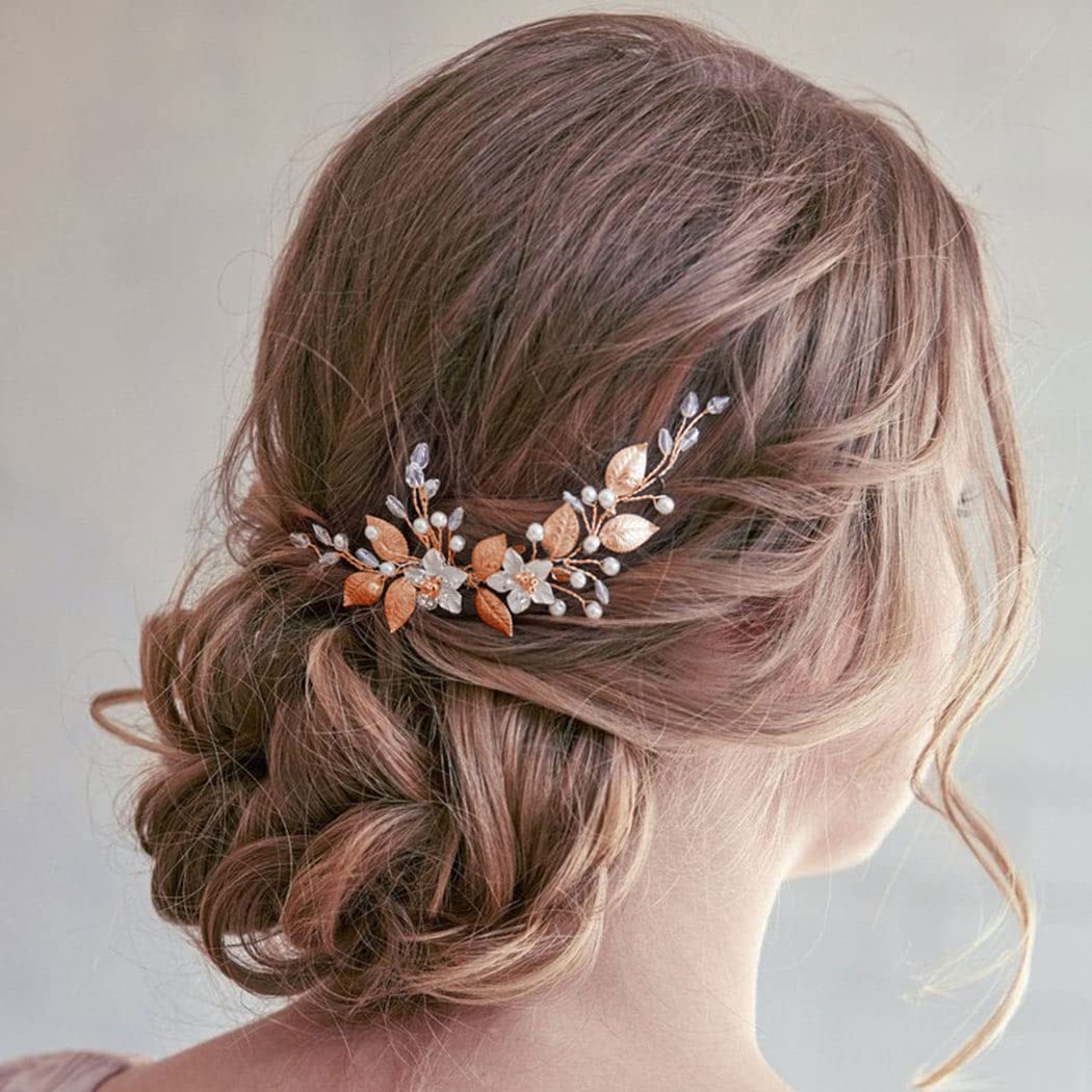 - Original Side Combs – Leaf Bride Wedding Hair Combs Flower Bridal Hair Piece Pearl Rhinestone Hair Accessories for Women and Girls (Pack of 2) (Rose Gold) by Aukmla