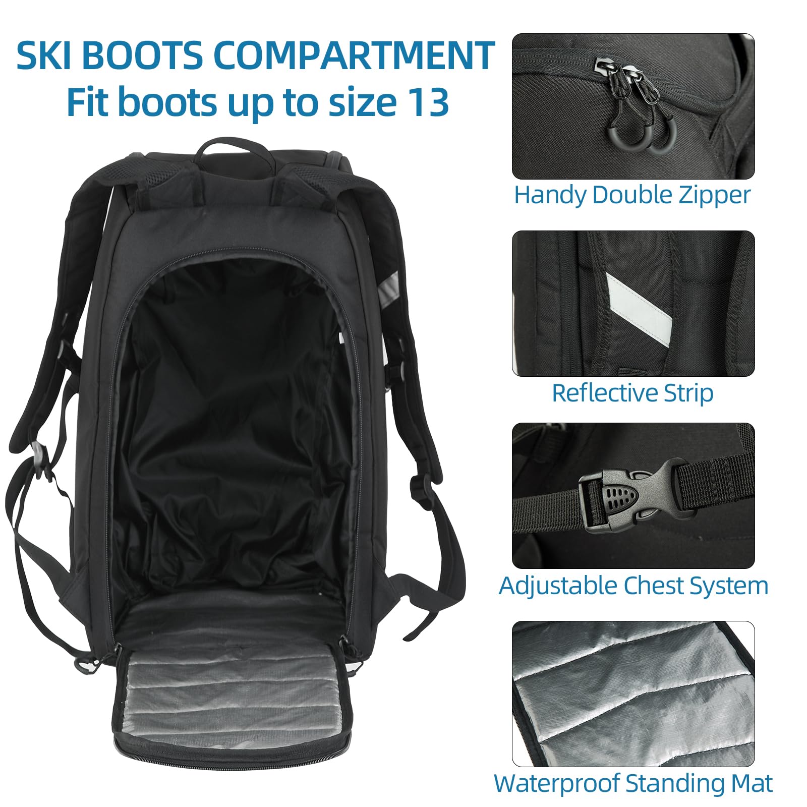 - 45L Ski Boot Backpack : 20*11.5*12 inch; It fits snowboard boots up to size 13. The ski bag features a newly designed one. It can easily store your ski boots, helmets, skates, goggles, clothing, ski accessories etc