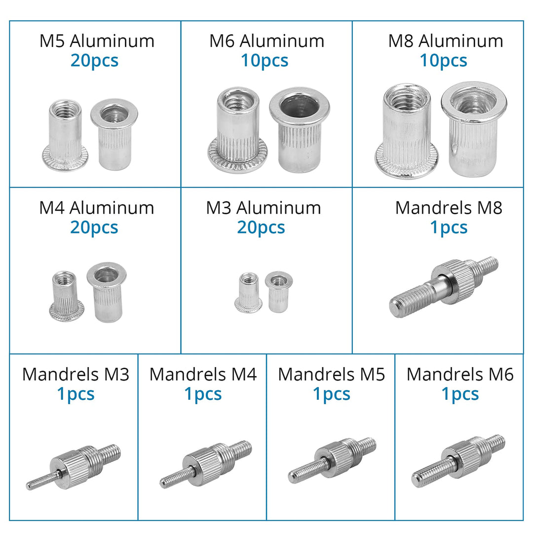 - Complete AccessoriesThis rivet nut kit comes with 5 mandrels: M3/M4/M5/M6/M8, and 80 pcs rivet nuts: 20*M3, 20*M4, 20*M5, 10*M6, 10*M8. Meet your various needs.
