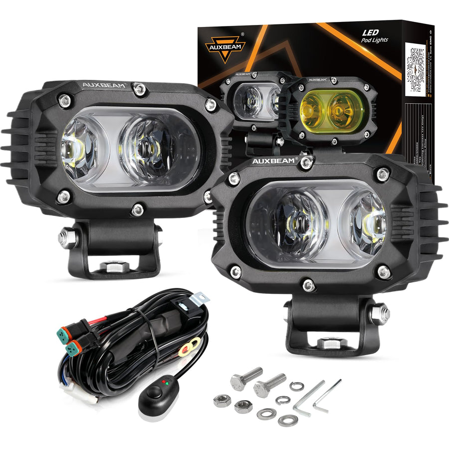 - WHAT YOU GET2pcs ultar bright led driving lights, 1 x auxbeam wiring harness kit, 1 x mounting brackets. If you have any questions and problems during installation, please feel free to contact us, we will reply you within 12 hours and provide you with perfect after-sales service