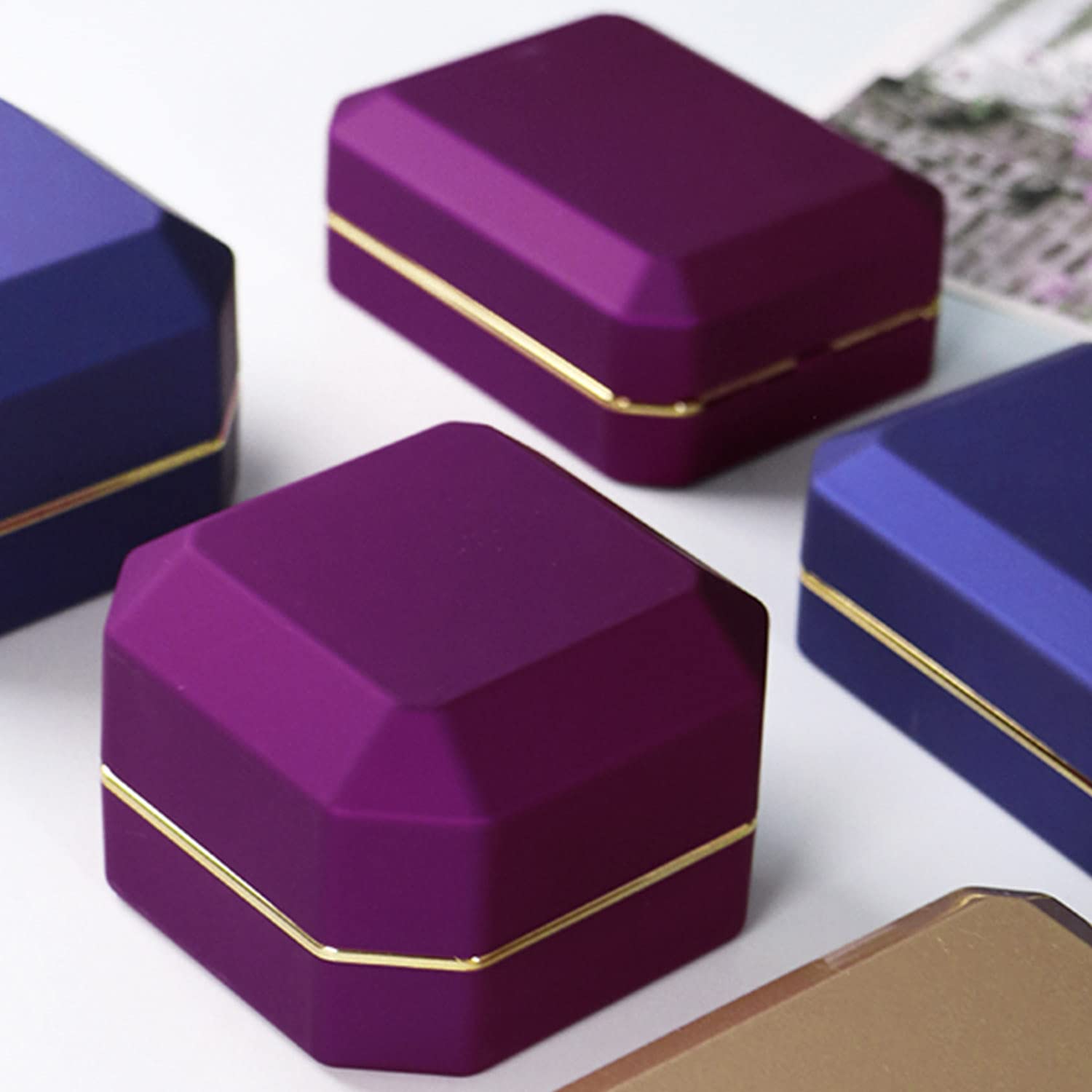 - BEST HELPER FOR YOUR PROPOSAL: Purple color, without any logo. You can easily store the box in your bag to take up very little space. It will help you create a romantic atmosphere with the LED Light when propose or engagement. It will give your lover a big surprise when opening the ring box.