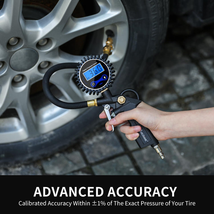 Professionally calibrated to always return an accurate reading within 1% of the exact pressure of your tire and display to 0.1 resolution, no more guessing with this tire pump pressure gauge.