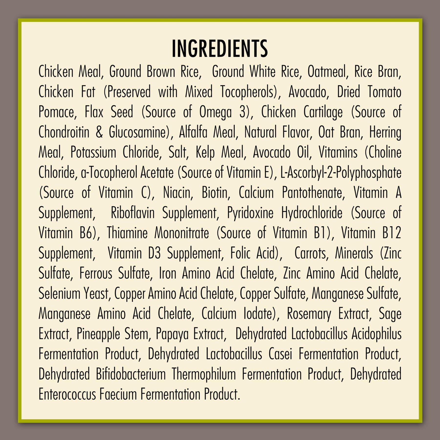 | ingredients | Chicken Meal, Ground Brown Rice, Ground White Rice, Oatmeal, Rice Bran, Chicken Fat (Preserved with Mixed Tocopherols), Avocado, Dried Tomato Pomace, Flax Seed (Source of Omega 3), Chicken Cartilage (Natural Source of Chondroitin & Glucosamine), Alfalfa Meal, Natural Flavor, Oat Bran, Carrots, Herring Meal, Potassium Chloride, Salt, Kelp Meal, Vitamins (Choline Chloride, a-Tocopherol Acetate (Source of Vitamin E), L-Ascorbyl-2-Polyphosphate (Source of Vitamin C), Biotin, Niacin, Calcium Pantothenate, Vitamin A Supplement, Riboflavin Supplement, Thiamine Mononitrate (Source of Vitamin B1), Vitamin B12 Supplement, Pyridoxine Hydrochloride (Source of Vitamin B6), Vitamin D3 Supplement, Folic Acid), Minerals (Zinc Sulfate, Ferrous Sulfate, Iron Amino Acid Chelate, Zinc Amino Acid Chelate, Selenium Yeast, Copper Amino Acid Chelate, Copper Sulfate, Manganese Sulfate, Manganese Amino Acid Chelate, Calcium Iodate), Avocado Oil, Rosemary Extract, Sage Extract, Pineapple Stem (Source of Bromelain), Papain, Dehydrated Lactobacillus Acidophilus Fermentation Product, Dehydrated Lactobacillus Casei Fermentation Product, Dehydrated Bifidobacterium Thermophilum Fermentation Product, Dehydrated Enterococcus Faecium Fermentation Product. |
