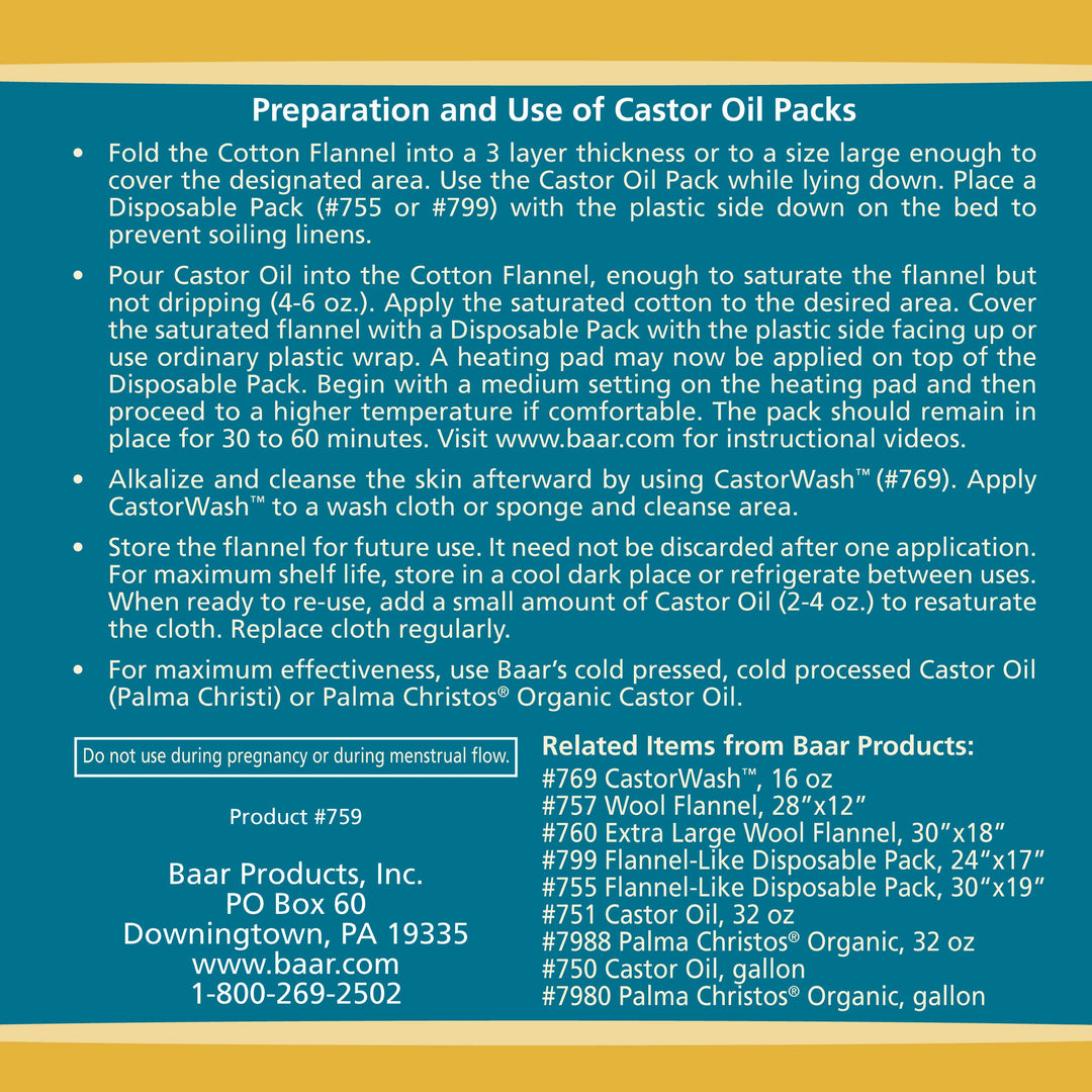 | directions | Fold the Cotton Flannel into a 3 layer thickness or to a size large enough to cover the designated area. Place a Baar Disposable Pack on your bed to prevent soiling linens. Pour Castor Oil onto the Cotton Flannel, enough to saturate the flannel but not dripping. Apply the saturated cloth to the desired area. Cover with a disposable pack and a heating pad or just heating pad. Cleanse the skin afterward by using CastorWash. Can be used many times. For best results use Baar Castor Oil. |