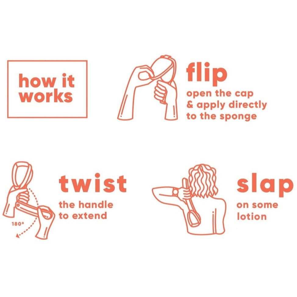 | directions | 1.FLIP open the cap and apply your lotion directly to the sponge. 2.TWIST the handle 180 degrees clockwise and it locks in place, giving you an extension and added length of 14.5’’. 3.SLAP on your lotion using bakslap over the parts of your body that need coverage, adding more to the sponge if required. |