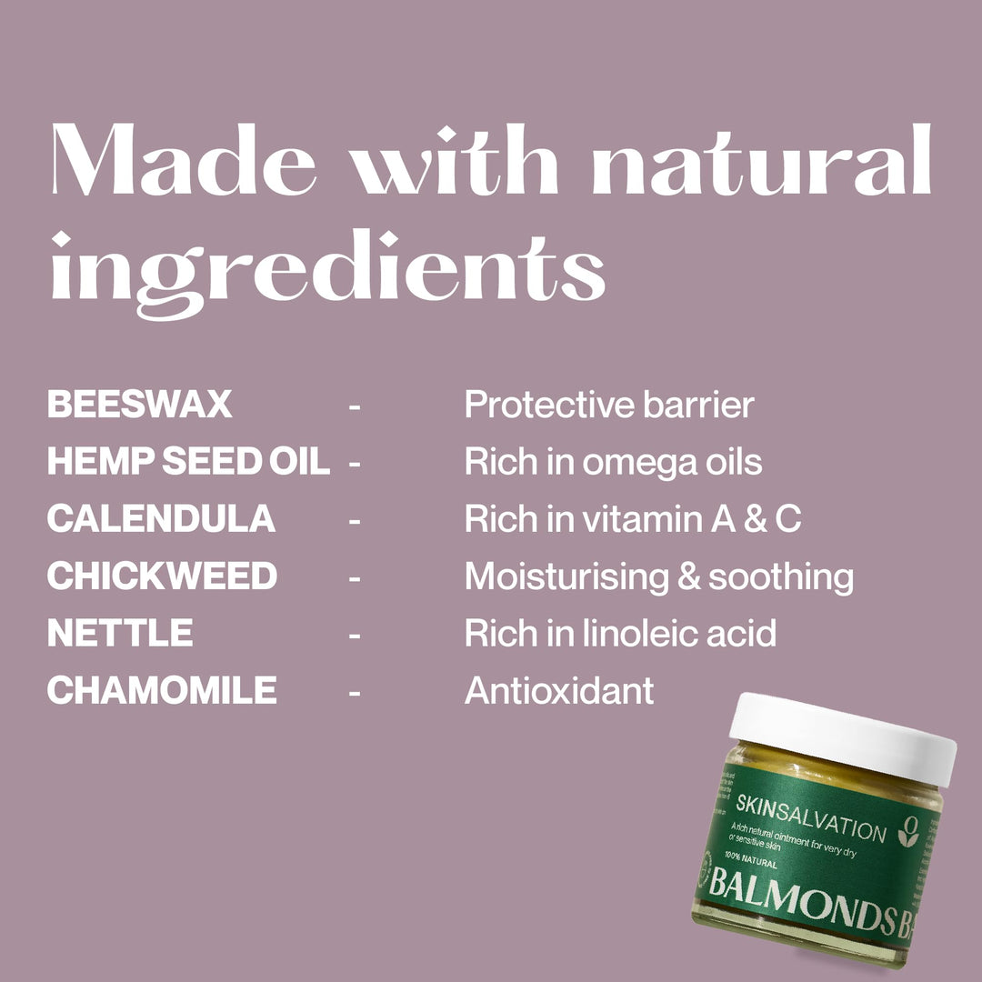- Original Lotions – Skin Salvation Intensive Moisturizer – All-Natural Balm for Dry & Sensitive Skin with Calendula, Hemp & Beeswax. Premium, Hydrating Salve, 1 Oz (30 ml) by Balmonds