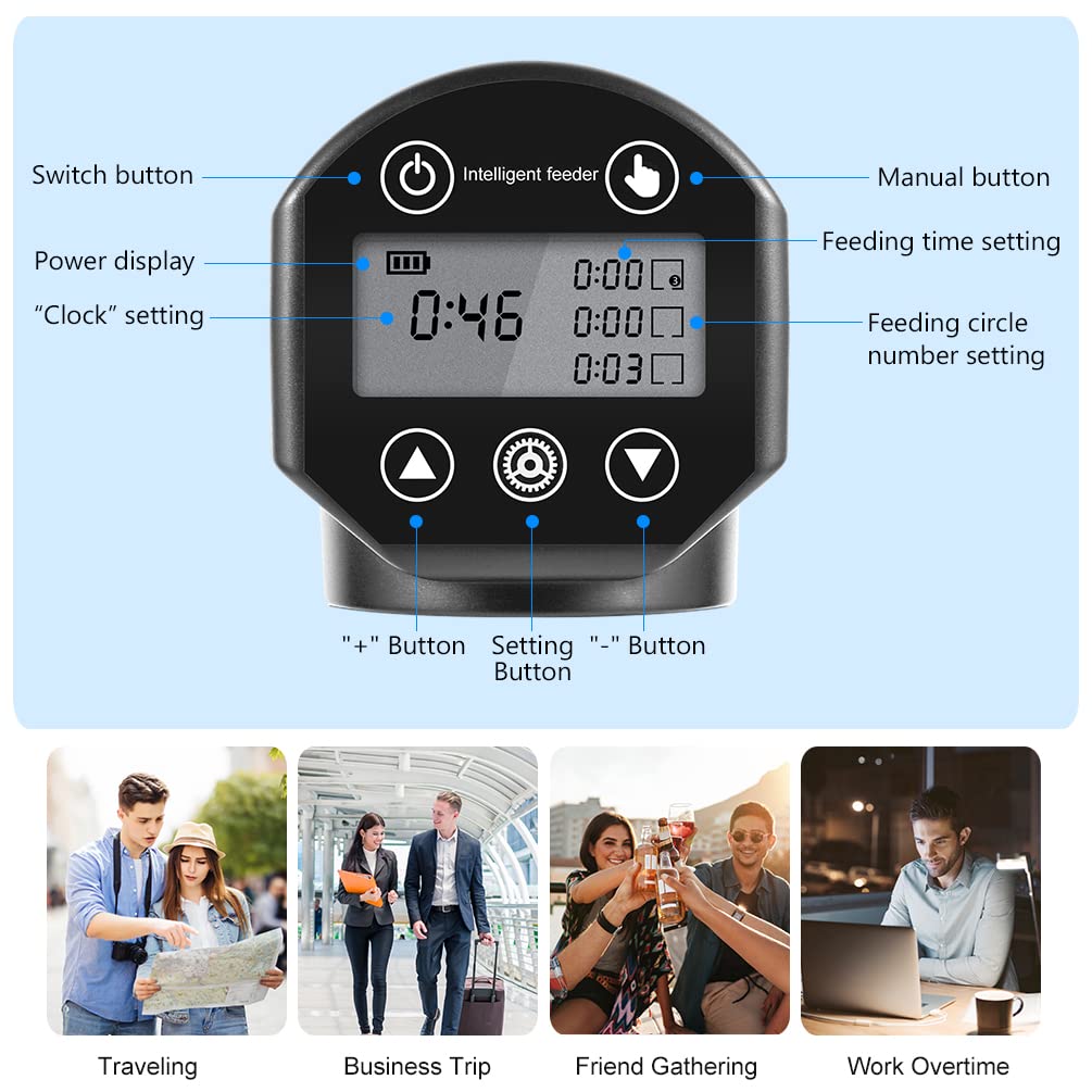 - Programmable: Barkmew Automatic Fish Feeder allows you to set up to 3 automatic feedings per day. You can program it to feed at any hour of the day or night and have it deliver either a single or double or triple feeding. At the same time, you can also feed manually and experience the fun of feeding.