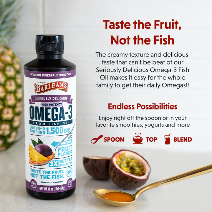 - Original Omega-3 – Barlean's Passion Pineapple High Potency Omega 3 Fish Oil Liquid Supplement, 1500mg EPA & DHA Fatty Acid, Smoothie Flavored & Burpless for Brain, Joint, & Heart Health, 16 oz by Barlean's