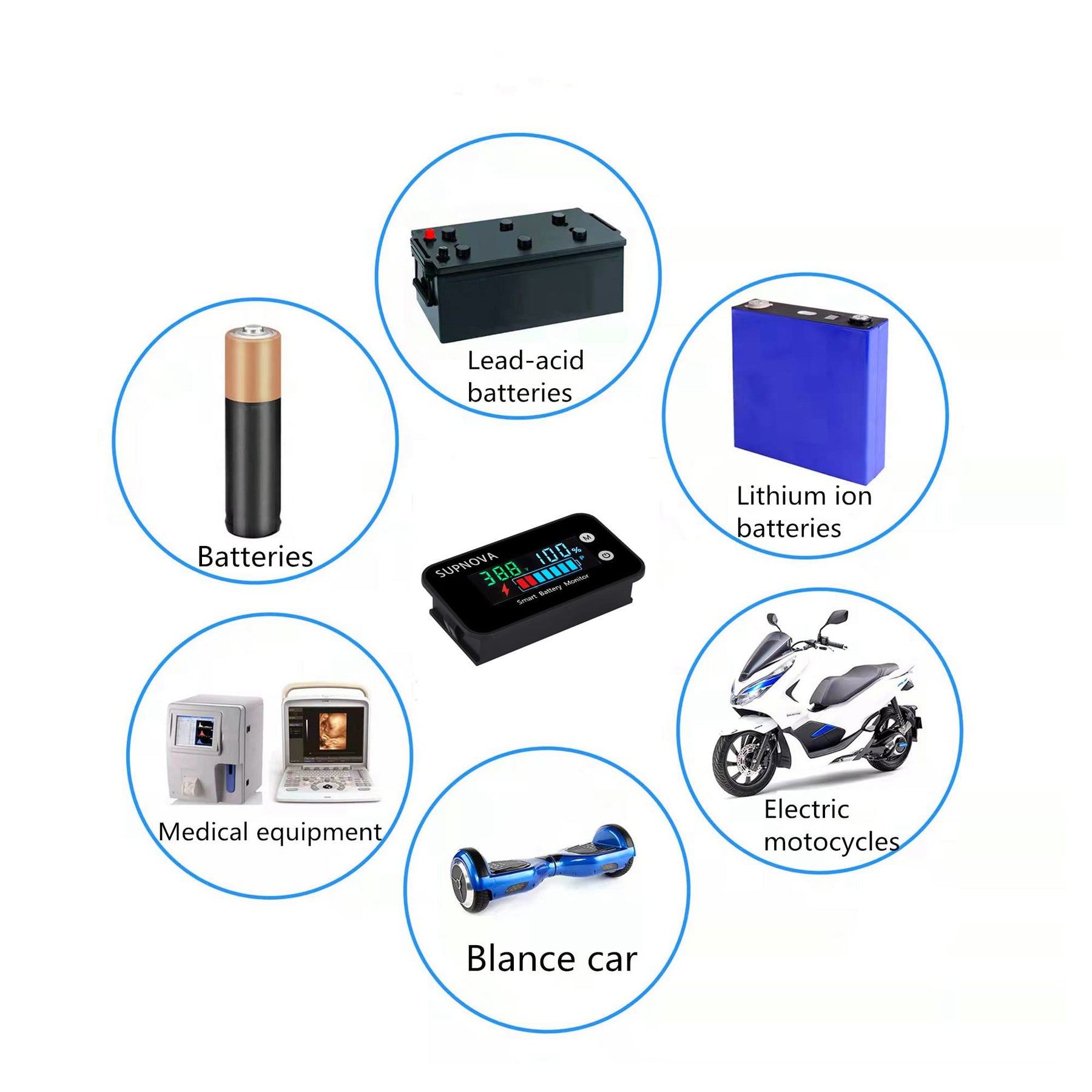 - APPLICABLE BATTERY --- The digital battery monitor is suitable for 7-100V (12v 24v 36v 48v 60v 72v 84v) Ternary lithium battery, lead-acid,AGM battery, LiFePO4 battery. Default 12 volt lead acid battery .