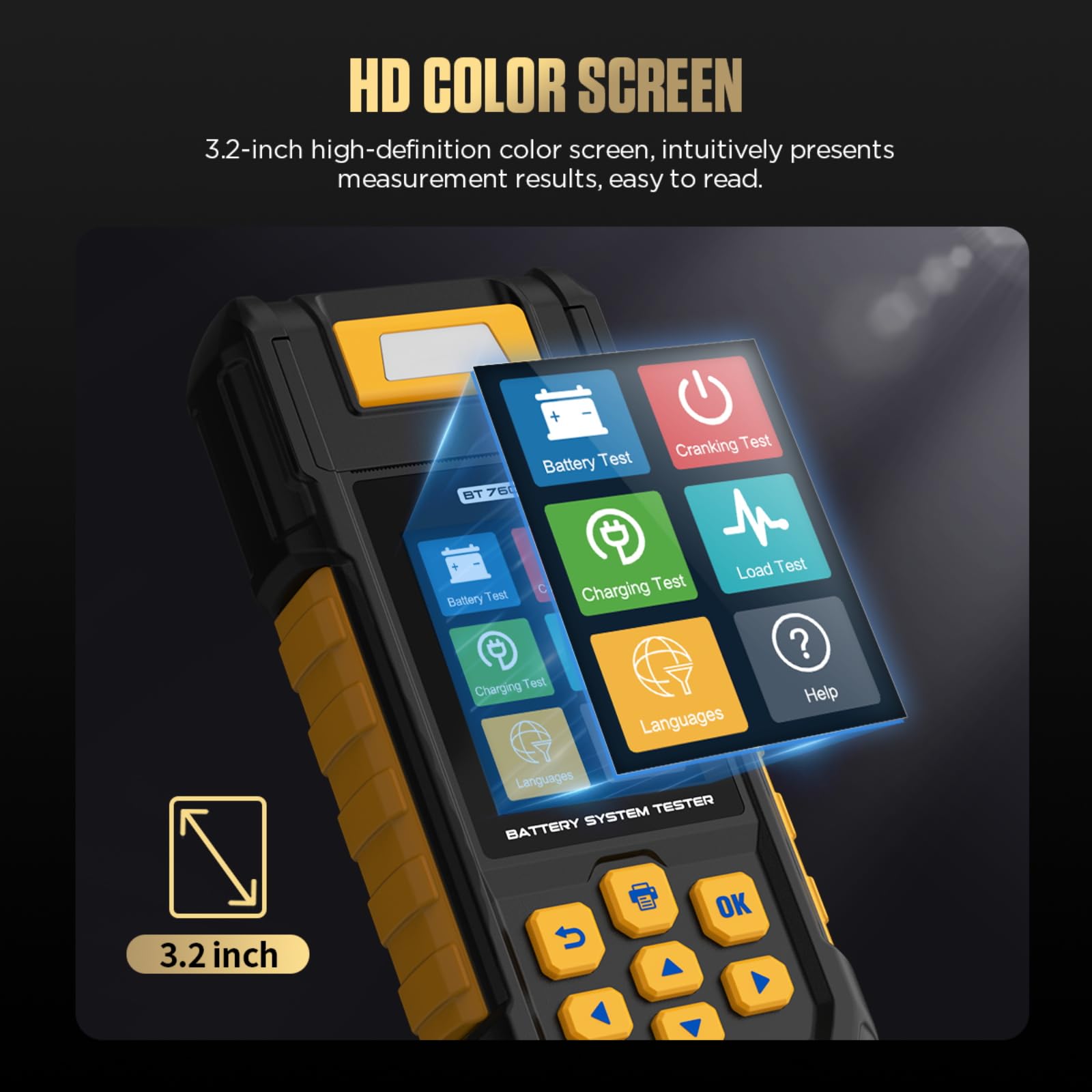 - 🆕MAX LOAD & CRANKING &BATTERY& CHARGING TESTBy using Color Screen Car Battery Tester, you will be able to inspect the overall health of your battery and perform a complete system charge test. Identifying battery status Good or Replace, and detecting common faults of the vehicle starting system and charging system quickly with advisable solution.