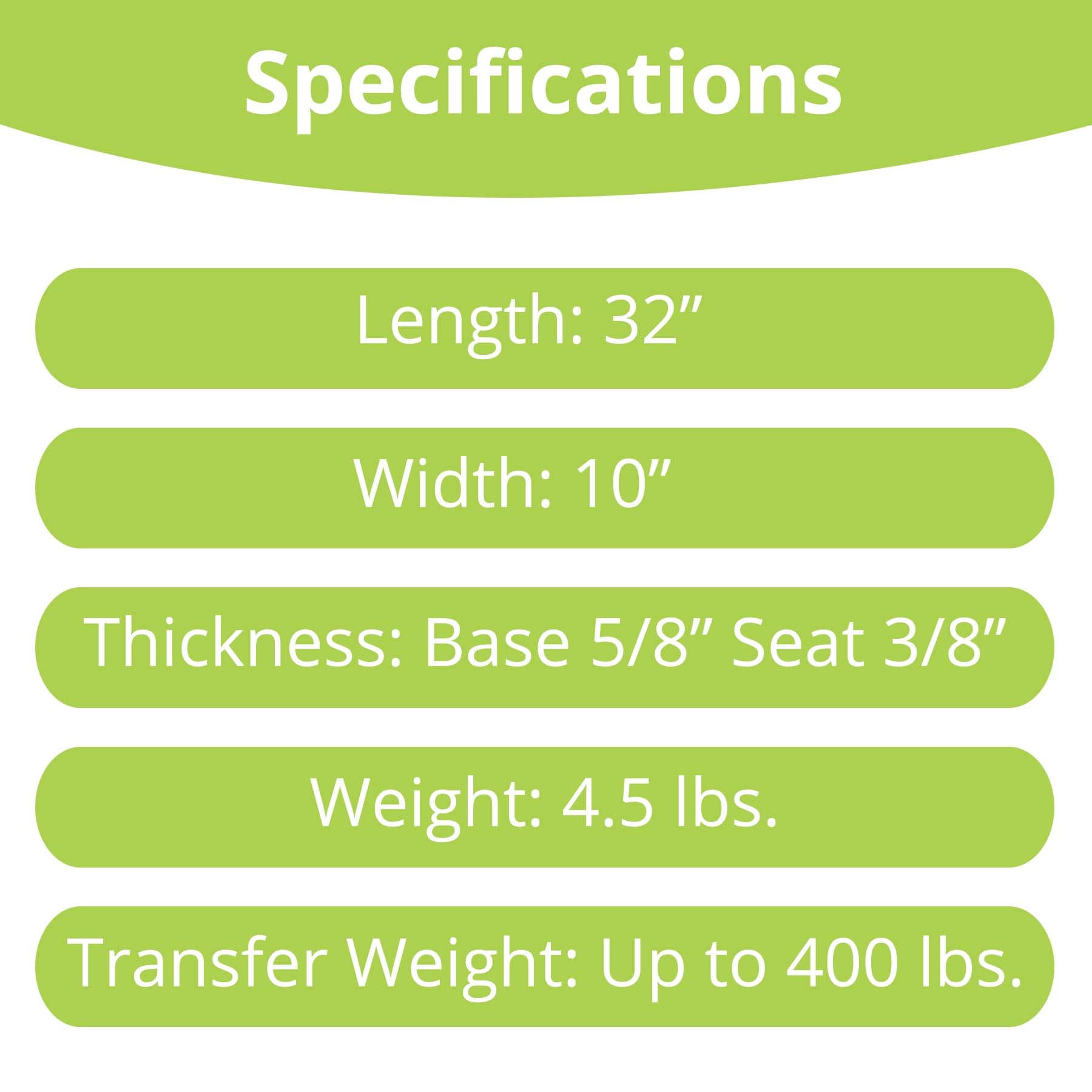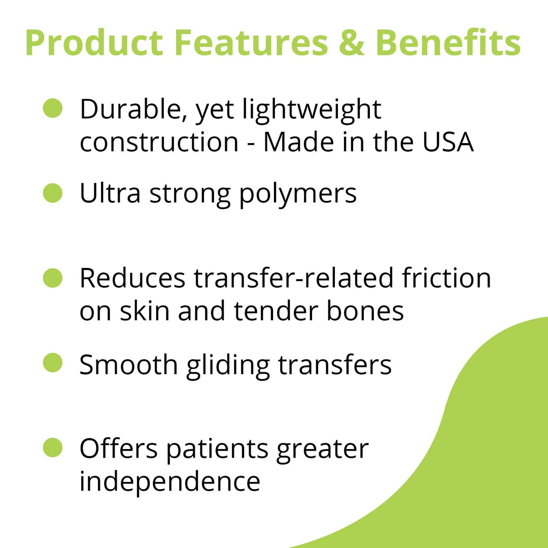 - Made of exceptionally strong plastic, each uniquely shaped board has a safe, comfortable disc that supports the user’s weight as it glides on the board’s track during transfer