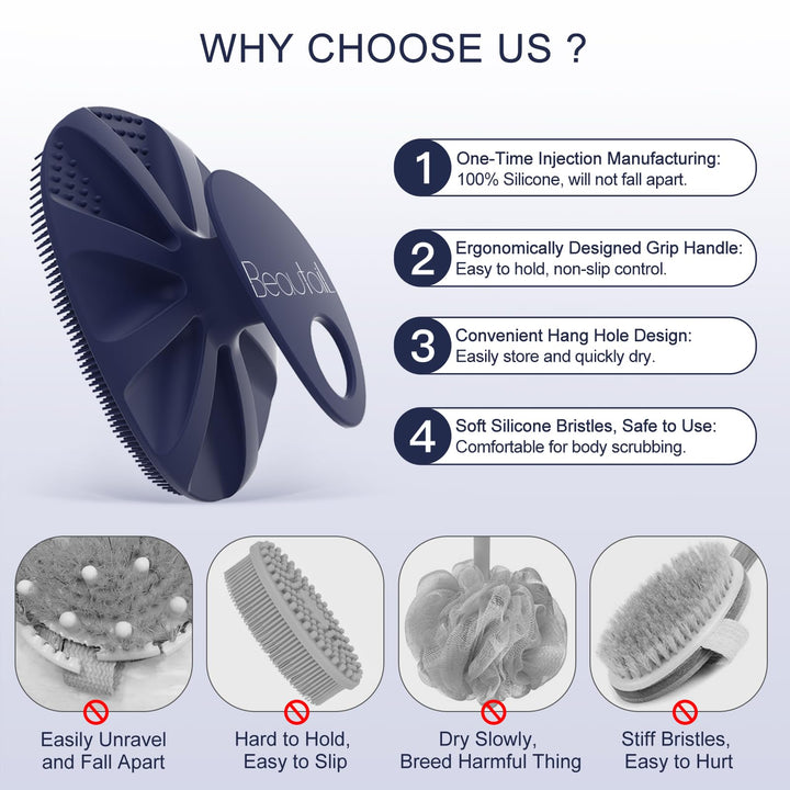 - MUCH SAFER AND MORE HYGIENIC: BEAUTAIL body scrubber is made from food-grade non-porous silicone, they dry so quickly and have self-cleaning properties, are less likely to develop any unpleasant substances.