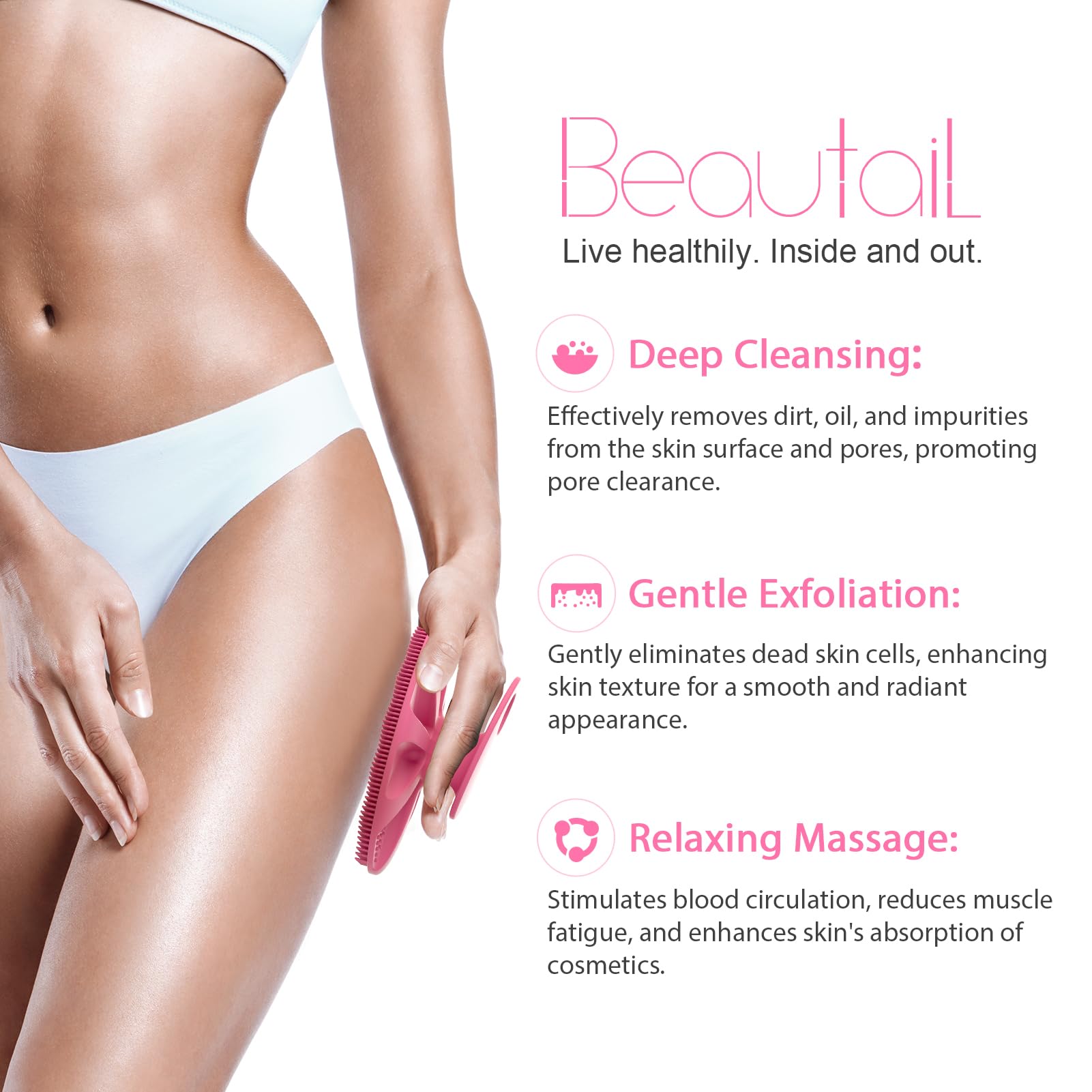 - MORE HYGIENIC AND SAFE: BEAUTAIL body scrubber is made of 100% natural, high-quality food-grade silicone material. Unlike traditional sponge and loofah, silicone bath brush is easy to clean, dry quickly, and doesn’t leave behind residue, it is also heat and water resistant, more durable and long last, more hygienic and healthy.