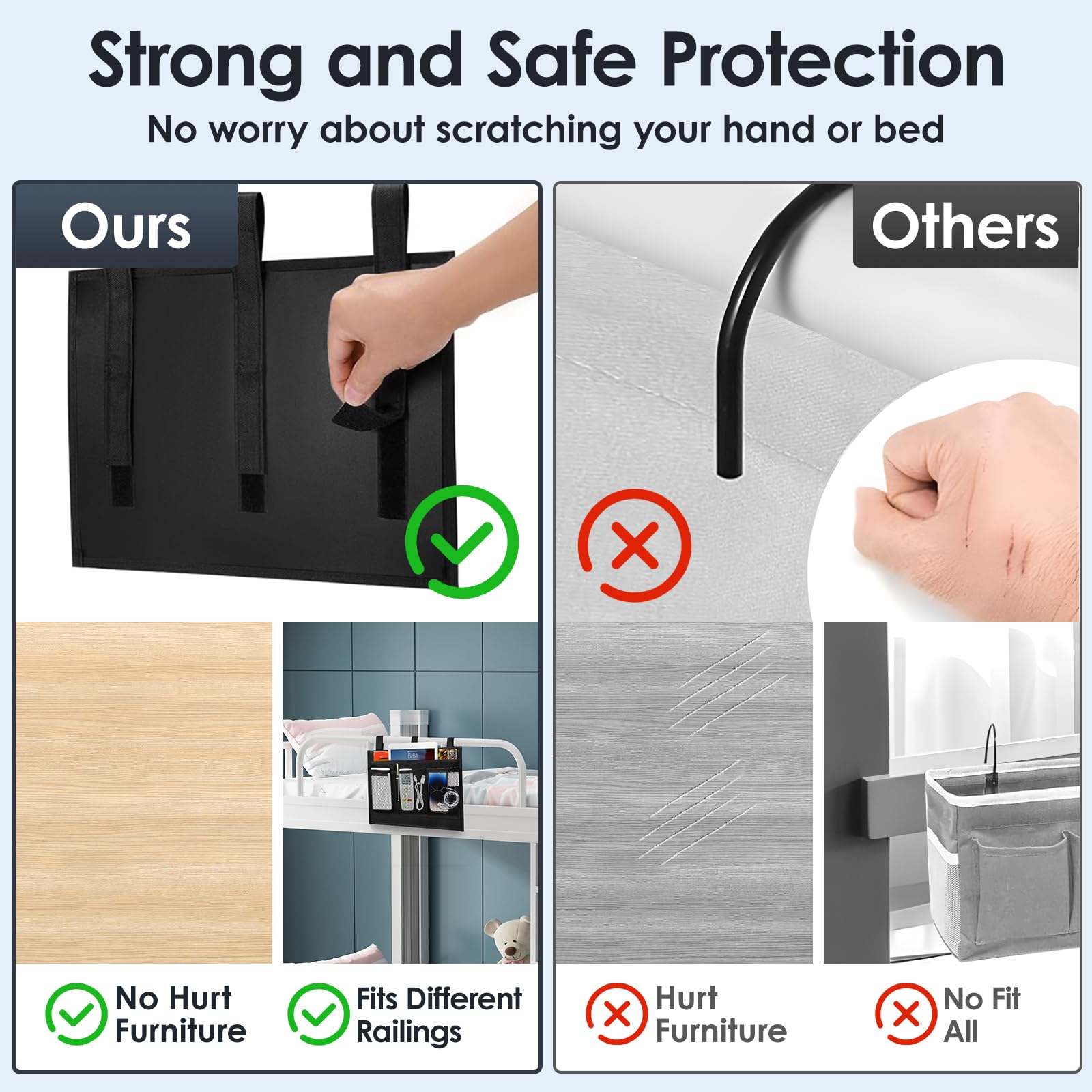 - Three Adjustable Strips.With three upgraded extended straps on the backside, our bedside storage allows you to hold your items firmly and securely in place and make sure the caddy will not slide out of the headboard or bed rail. The straps design gives you more strong and safe protection to meet your needs of any length(Total Length of the Strips: 33cm/13 in.) No worry about scratching your hand or bed.
