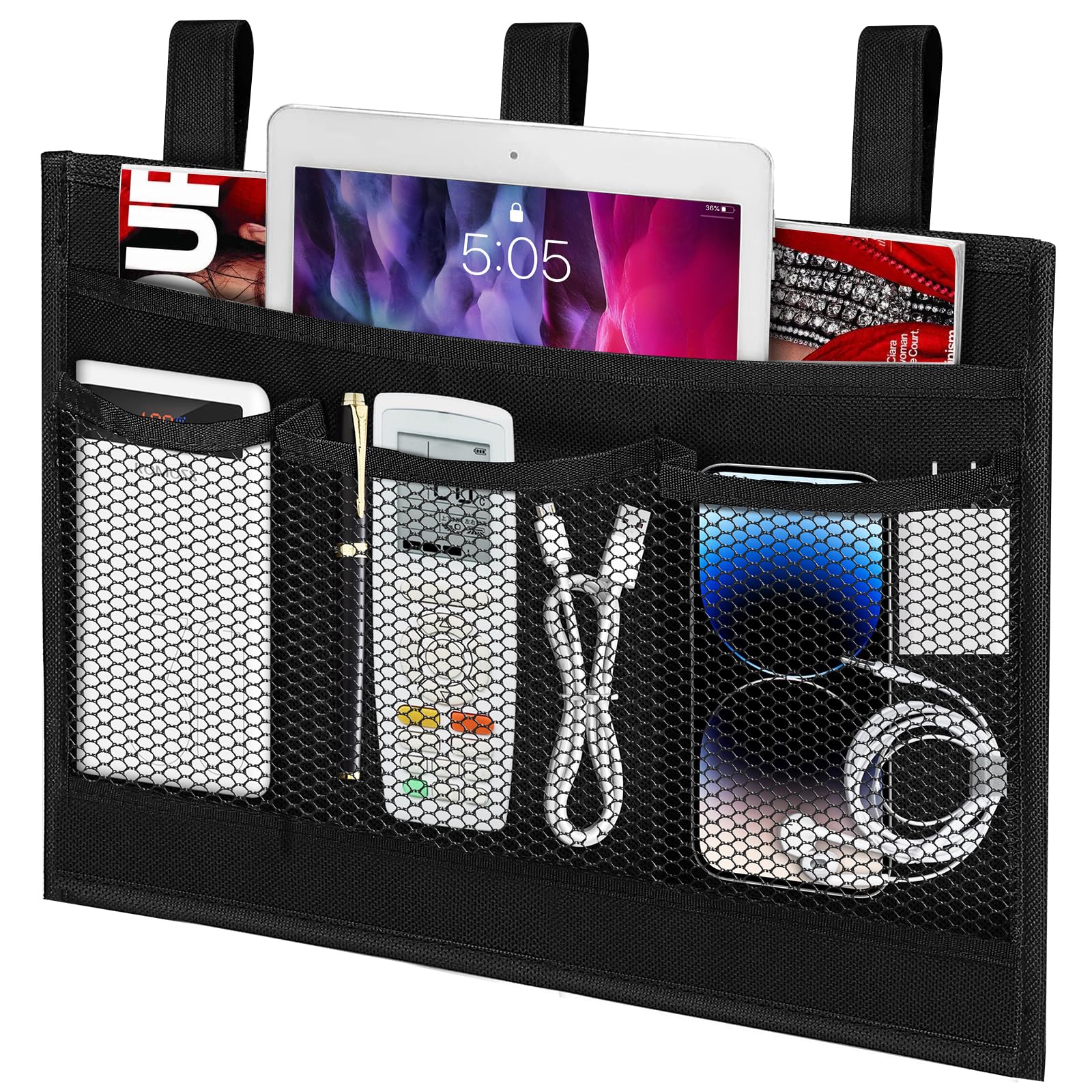 - Compact Size for Storage.Constructed with three mesh pockets and one large pocket, our beside caddy is perfect for holding and classifying your typical nightstand items like your remotes, flashlight, magazine, notebook, pack of tissue, kindle, phone, pad, paper and pen. Keep your things better organized and within your arm’s reach at all times. (Size: 13 L x 9.6 H)