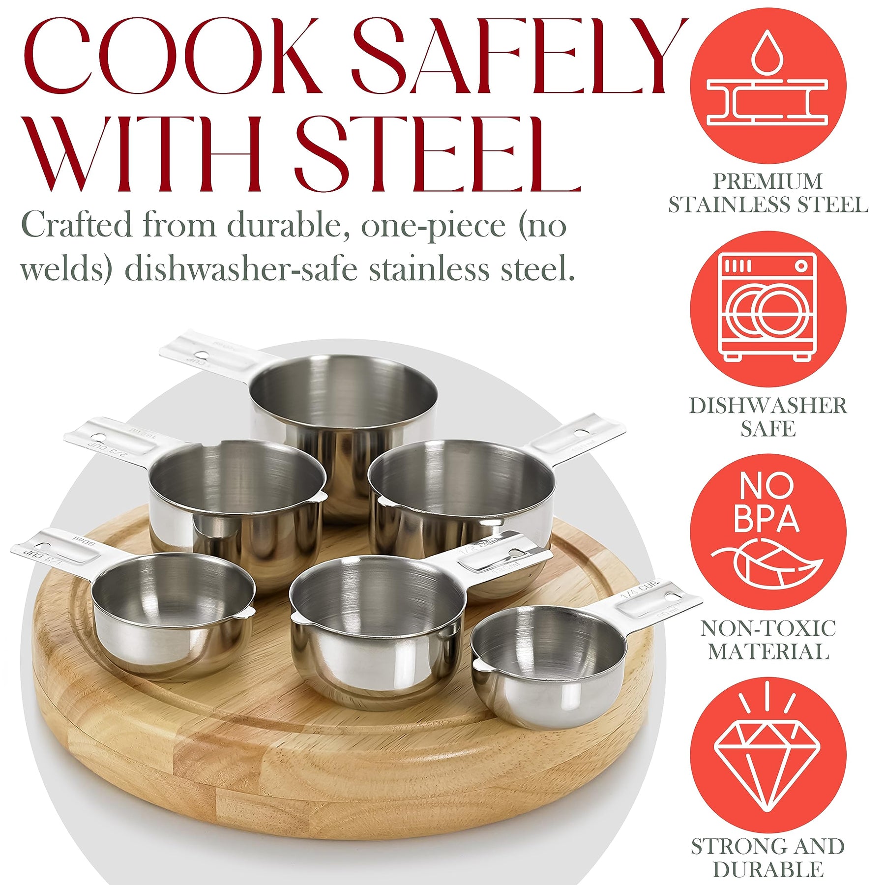 - COOK SAFELY WITH STEEL: You don’t want silicone or BPA-infested plastic to touch your cooking. We know that, so don’t worry: all of our measuring cups are crafted from durable, one-piece (no welds) dishwasher-safe stainless steel.