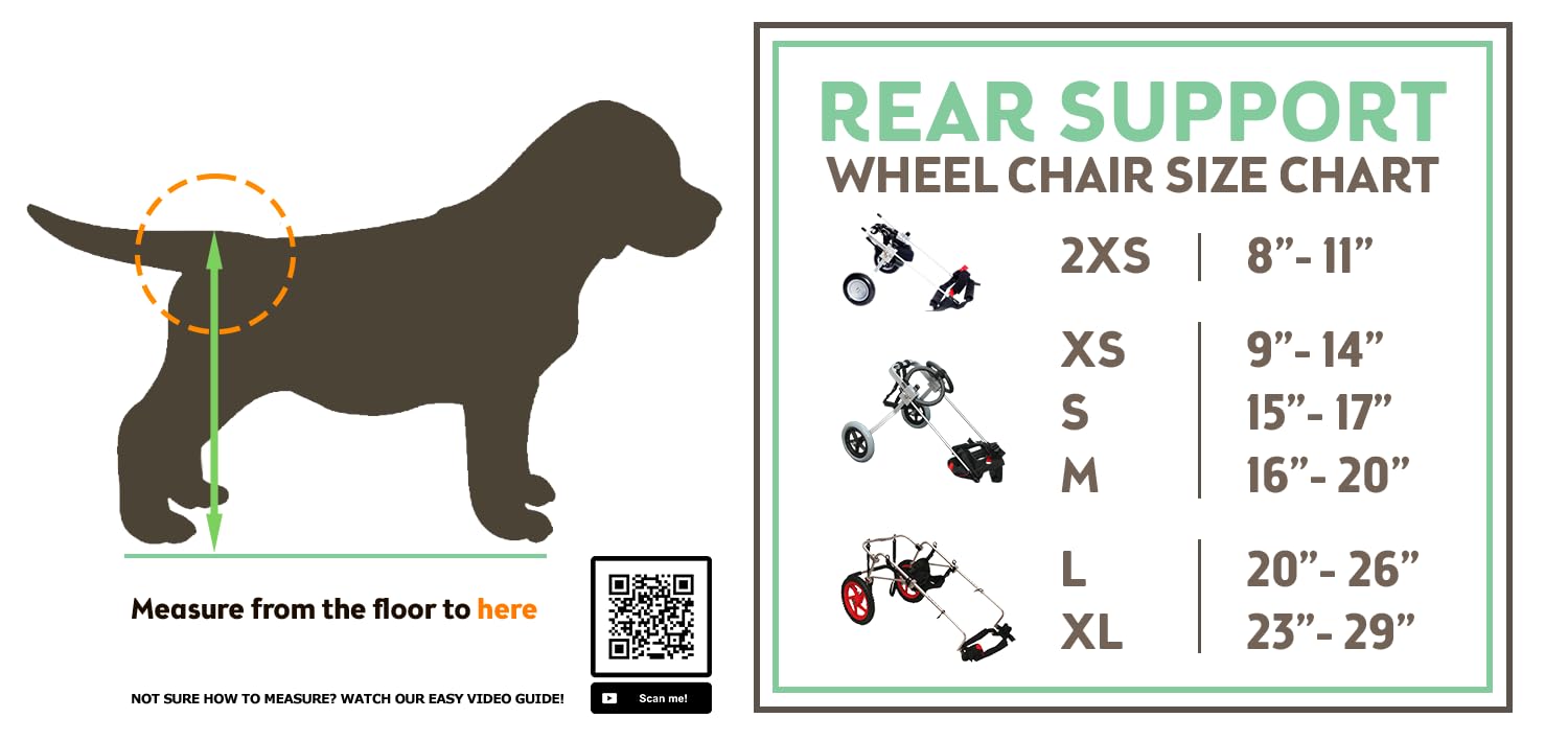 | directions | The measuring process to determine the ideal animal wheelchair is straightforward and simple. It might seem like you need to take multiple measurements, but we only need one measurement: the hindquarters. This simply means we need an accurate measurement from the distance of the floor to your pet’s back to equip them with the appropriate wheelchair. Please note that you may need help measuring your pet depending on the severity of their mobility issues. One person may need to support the hind legs of your pet while you take the measurement. If you’re also measuring for a front-range harness, you will need an accurate measurement of your pet’s chest as well. For the best measurement, you should wrap the tape measure around the widest part of your pet’s chest, which is behind their front legs. After you determine these measurements, you can use our wheelchair sizing chart to help you find the best wheelchair size for your dog or cat! We offer a range of sizes to accommodate many of our customers’ furry best friends. |