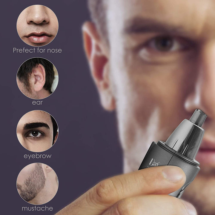 - Powerful & Safe: This rechargeable nose trimmer features a dual-edge spinning blades system, inner 360°rotating design, which can precisely remove the hairs without painful and unpleasant pulling. This mens nose hair trimmer spares you from the risk of pulling your hair or damaging your skin.