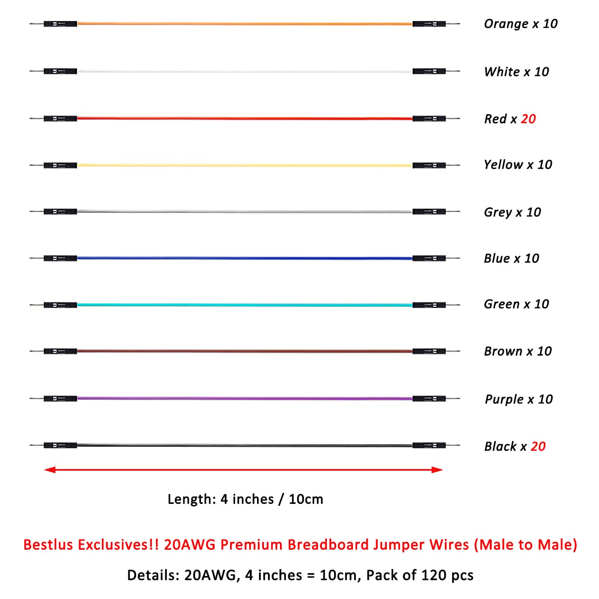 - MORE COLORS AND MORE CHOICES FOR YOU: Each package comes with 10 colors by 10 pieces each, 20% MORE Red and Black Jumpers for power lines, TOTAL 120 pieces/pack. Bestlus supplies male to male, male to female and female to female Jumper Wires with length 4''/6''/12''. These Jumper Wires work great with Breadboards and really any 0.1 pitch prototyping boards.