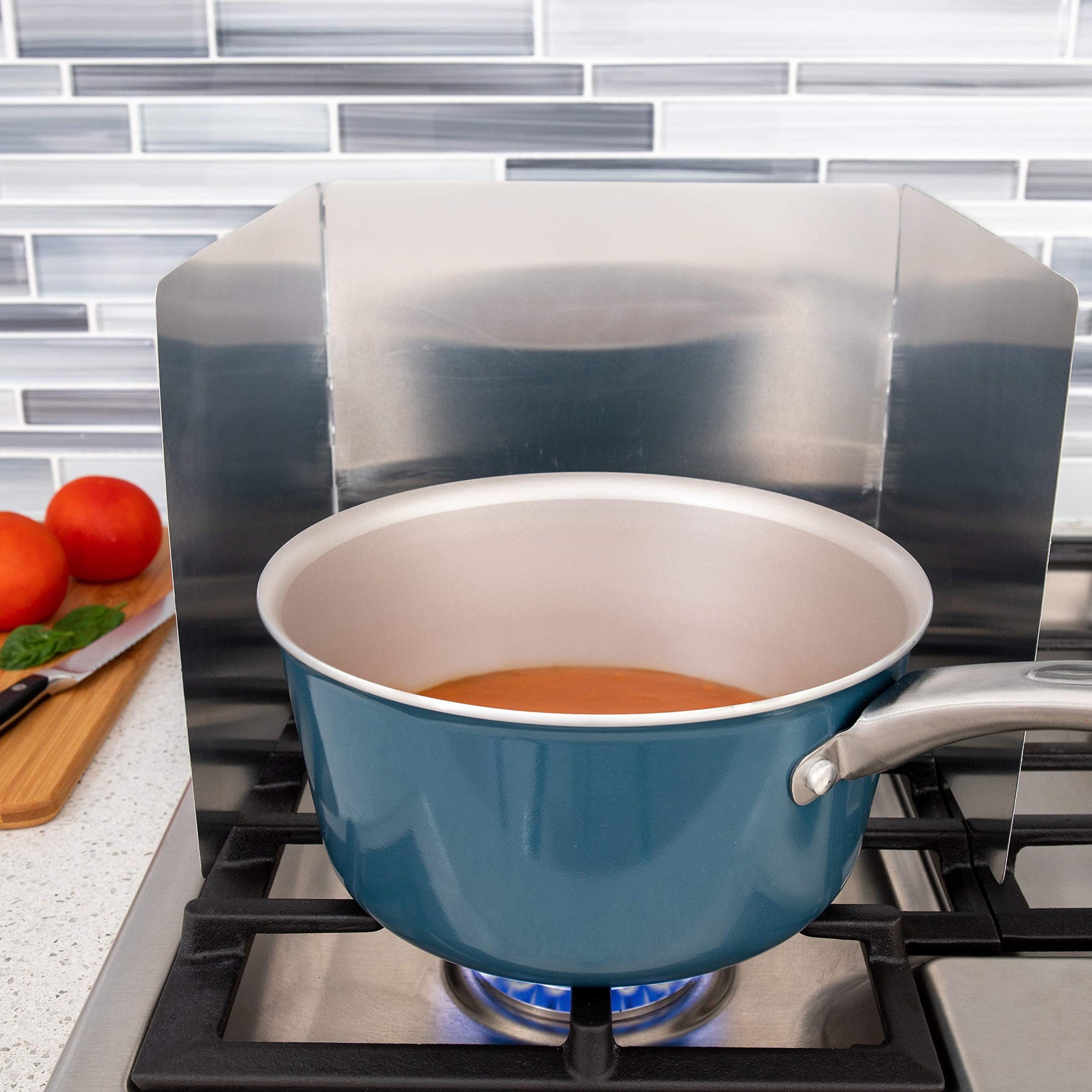 - The convenient aluminum shield has three hinged panels that adjust to fit any size burner or pan