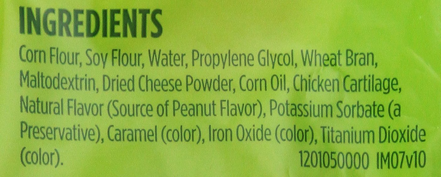 | ingredients | corn flour, soy flour, water, proplyene clycol, wheat bran, maltodextrin, dried cheese powder, corn oil, natural flavor (source of bacon flavor), potassium sorbate, (a preservative), caramel color, artifivial color (red #40, yellow#6). |