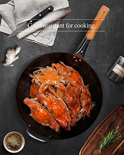 - Sturdy and durable: This carbon steel wok is equipped with a heat-resistant wooden handle and steel helper handle, they are riveted tightly and firmly. The helper handle makes it easier for lifting and to hang for storage.