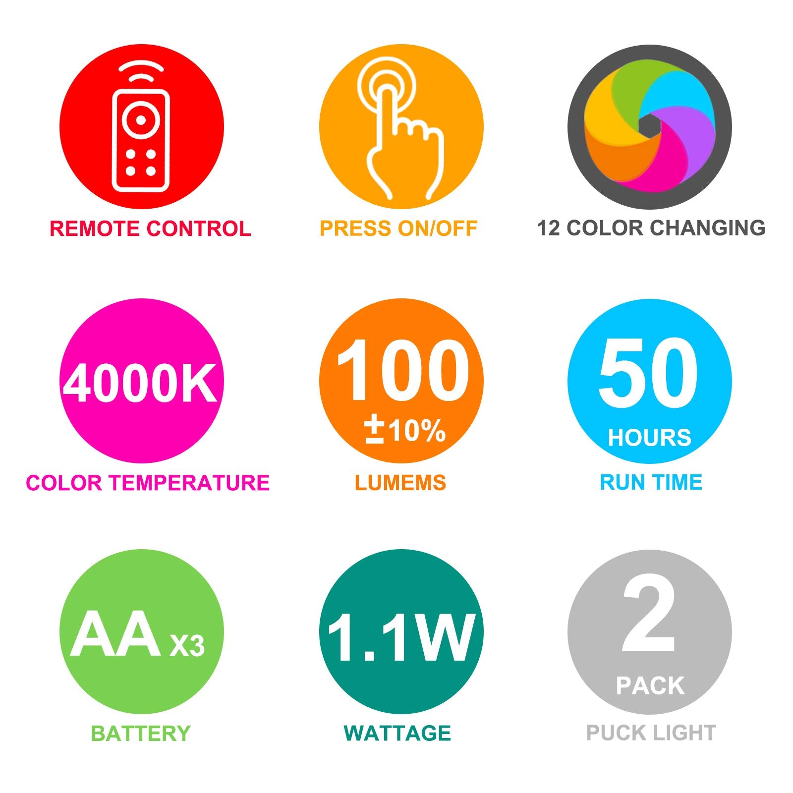 - 12 RGB Colors Changing & Super Bright LED 100 Lumens upgraded super bright LEDs with 4000K natural white lighting and 12 RGB colors changing. Powered by 3pcs AA batteries(not included) will be longer lasting.