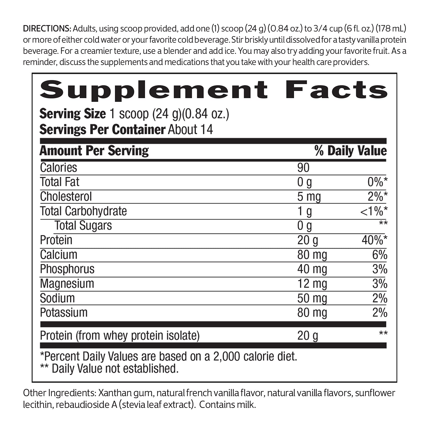 | directions | DIRECTIONS: ADULTS, USING SCOOP PROVIDED, ADD ONE (1) SCOOP (24 G) (0.84 OZ.) TO 3/4 CUP (6 FL OZ.) (178 ML) OR MORE OF EITHER COLD WATER OR YOUR FAVORITE COLD BEVERAGE. STIR BRISKLY UNTIL DISSOLVED FOR A TASTY VANILLA PROTEIN BEVERAGE. |