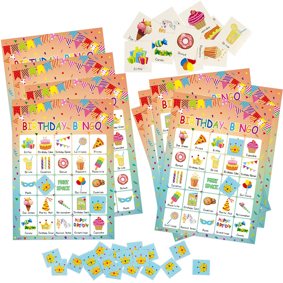 - Package Included: 24 Happy Birthday Bingo Game Cards, 441 Birthday crown bingo card chips, 24 call out cards, and Game Instructions; 7x 5 1/5 inches player cards; Easily cut along dotted lines of chips sheets and calling card sheet