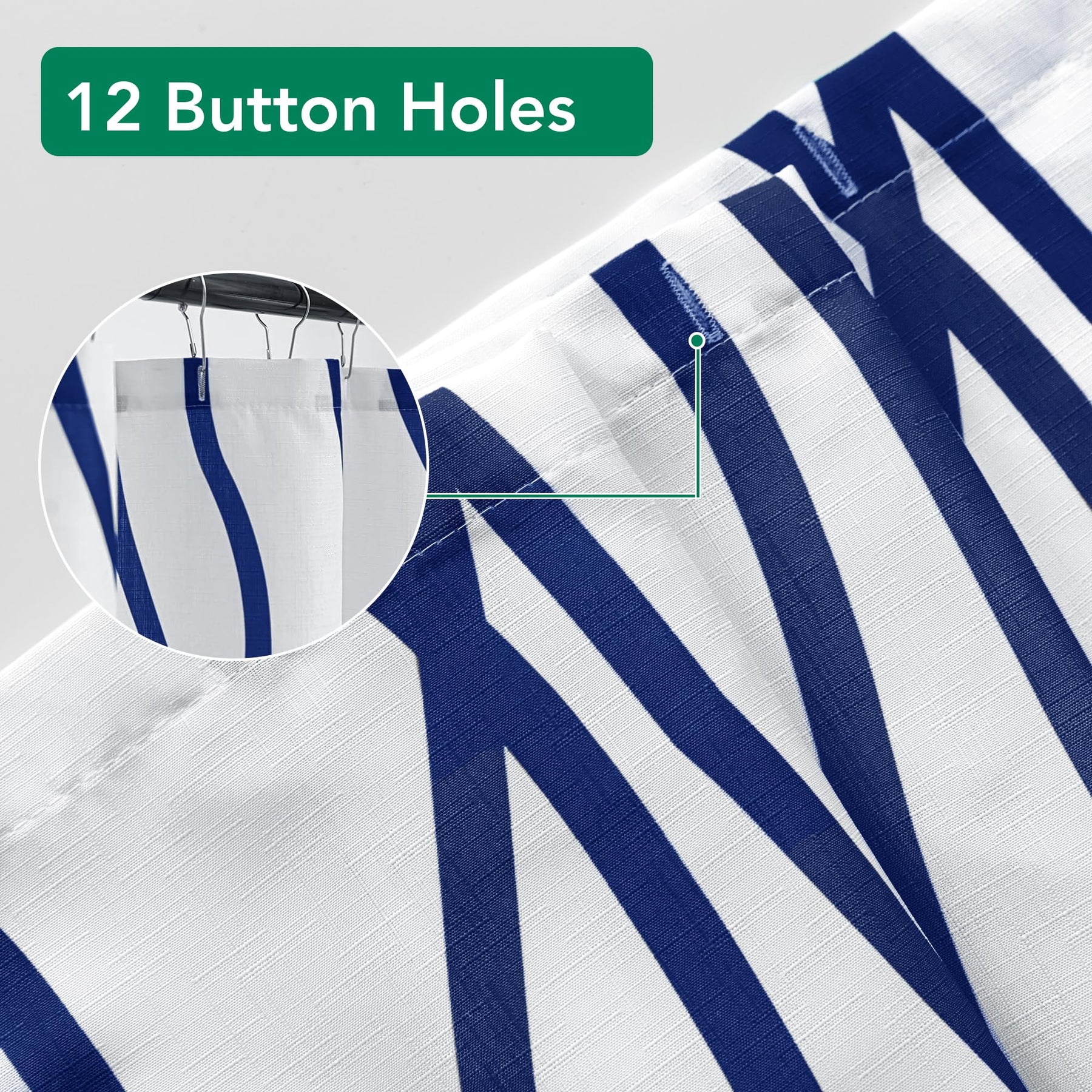 - Measures: 72 width by 84 length to fit standard tubs and showers with 12 button holes in the head.