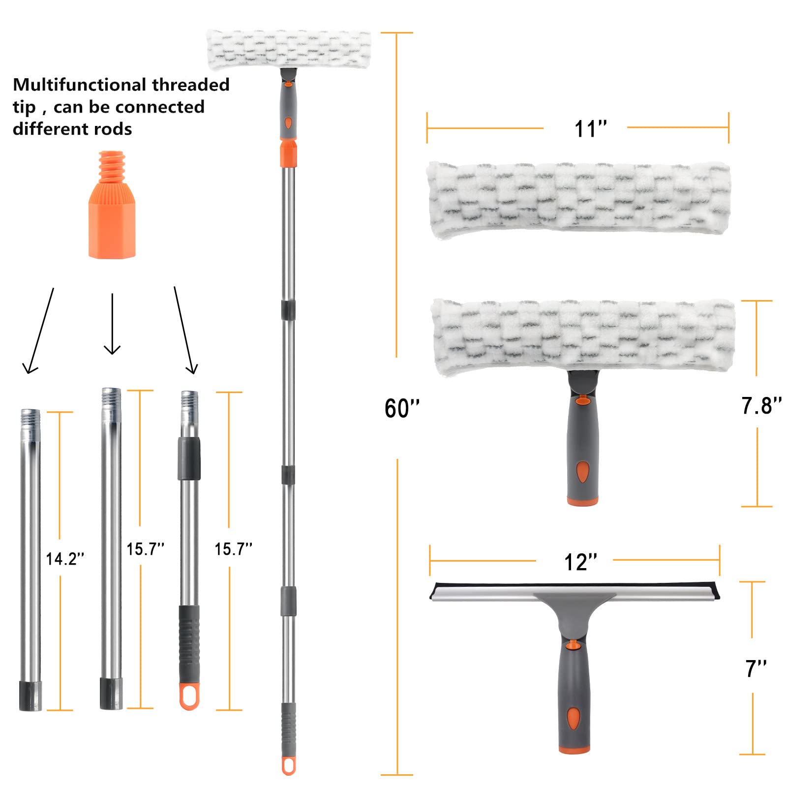 - Window Cleaning Kit: The multi-purpose window squeegee has soft squeegee rubber and free replacement microfiber cloths, come with a 3 section--include 2 section extend and 1 section telescopic, aluminum extendable pole for a total length of 60 inch. Upgrade design threaded tip, can connect to any of poles for adjusting the length of poles. Press the button can be rotated 180° to adjust different positions which makes cleaning windows quicker and cleaner.