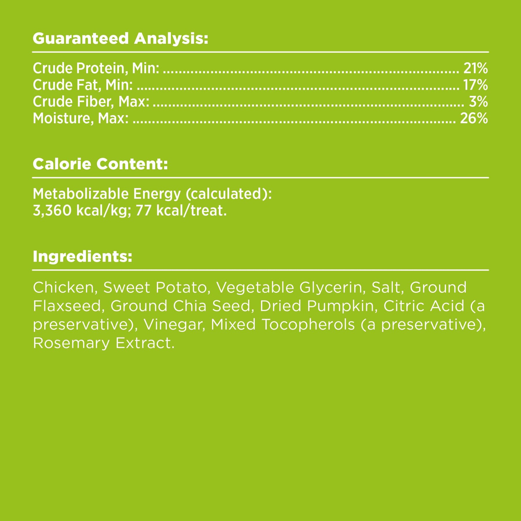 | ingredients | Chicken, sweet potato, vegetable glycerin, ground flaxseed, ground chia seed, dried pumpkin, salt, citric acid (a preservative), vinegar, mixed tocopherols (a preservative), rosemary extract. |