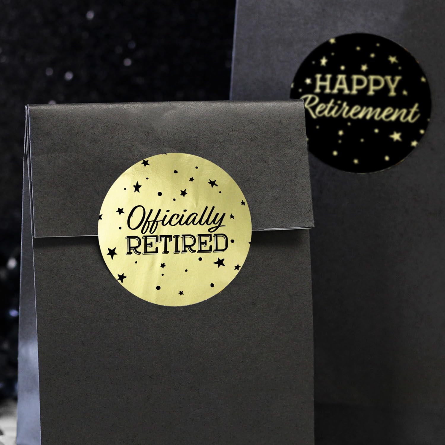 - REAL FOIL: the black and gold happy retirement designs are printed on real shiny metallic gold foil stickers for an extra pop to your party.
