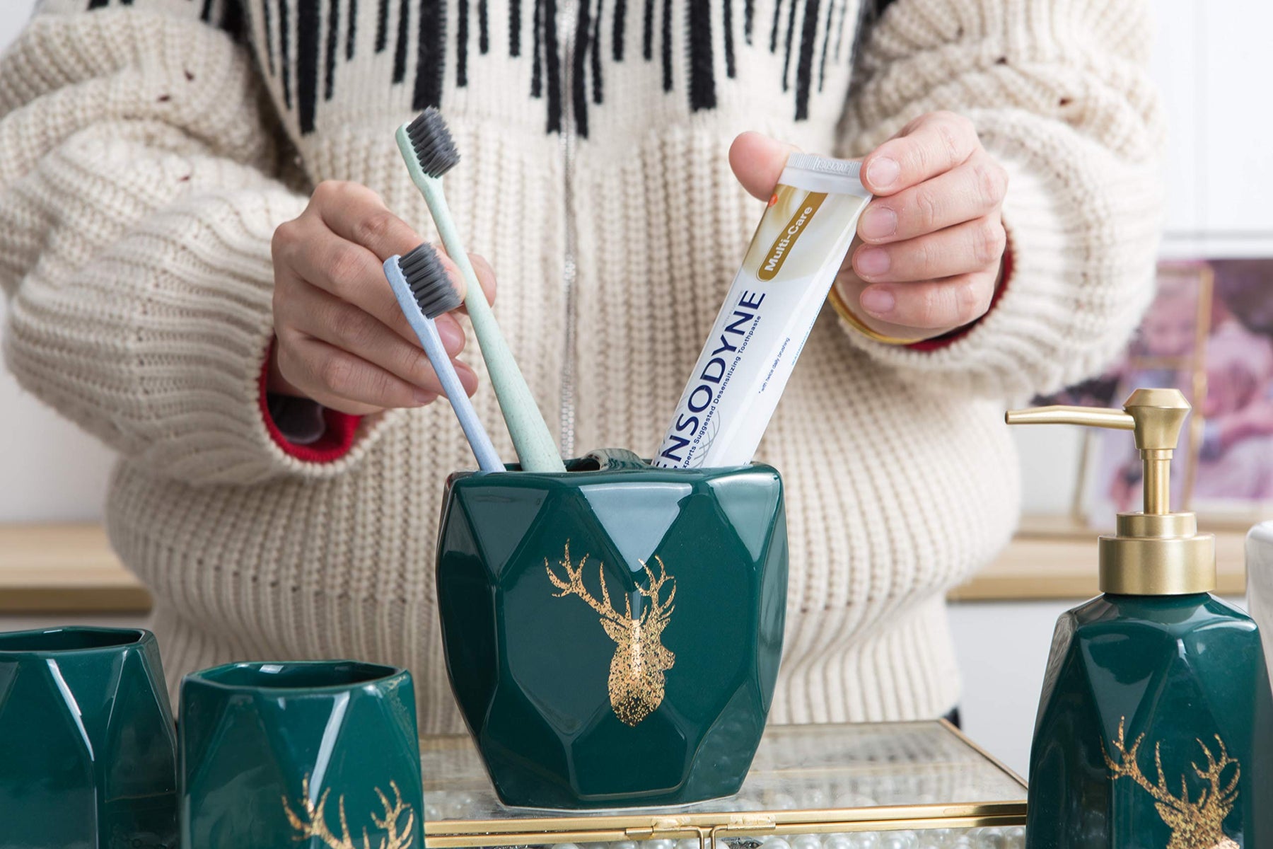 - Original Bathroom Accessory Sets – 5 Pieces Ceramic Bathroom Accessories Set, Bathroom Vanity Countertop Accessory Set, Include Soap Dispenser, Toothbrush Holder, 2 Tumbler, Soap Dish, Color: Hunter Dark Green… by BLBYHO