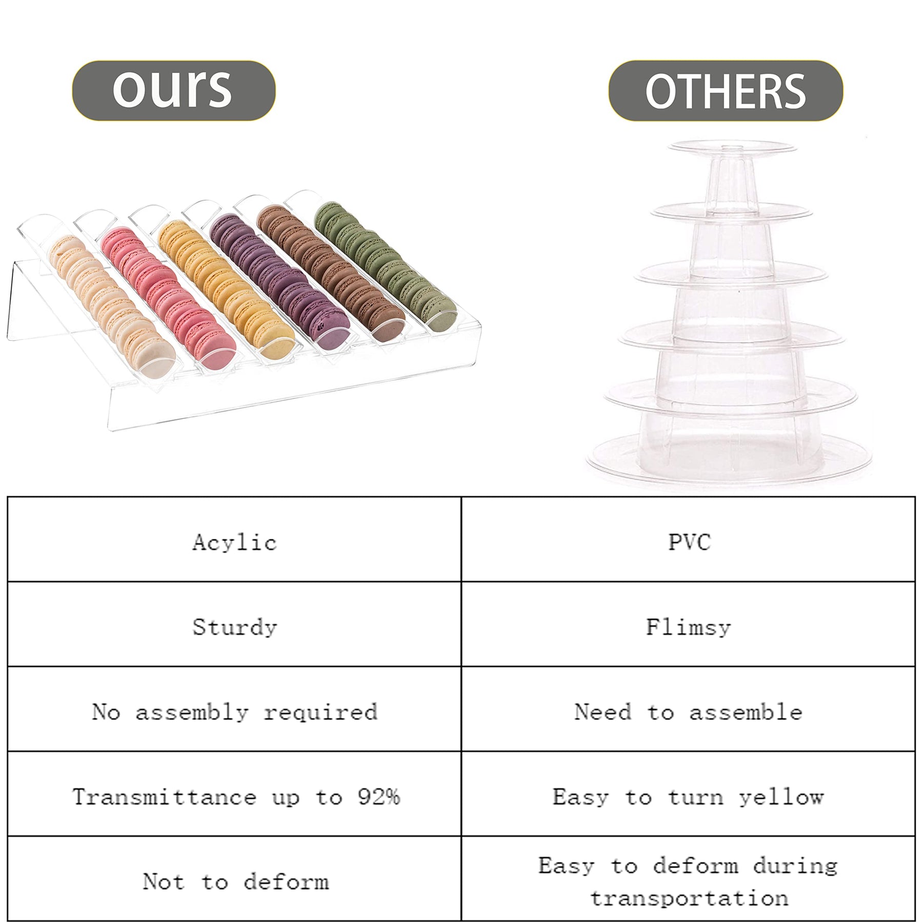 - High Quality: Our macaron display stand is made of high quality acrylic that not easy to yellowing. Tips: take off PROTECTIVE FILMS before use, you could find it is clear as glass