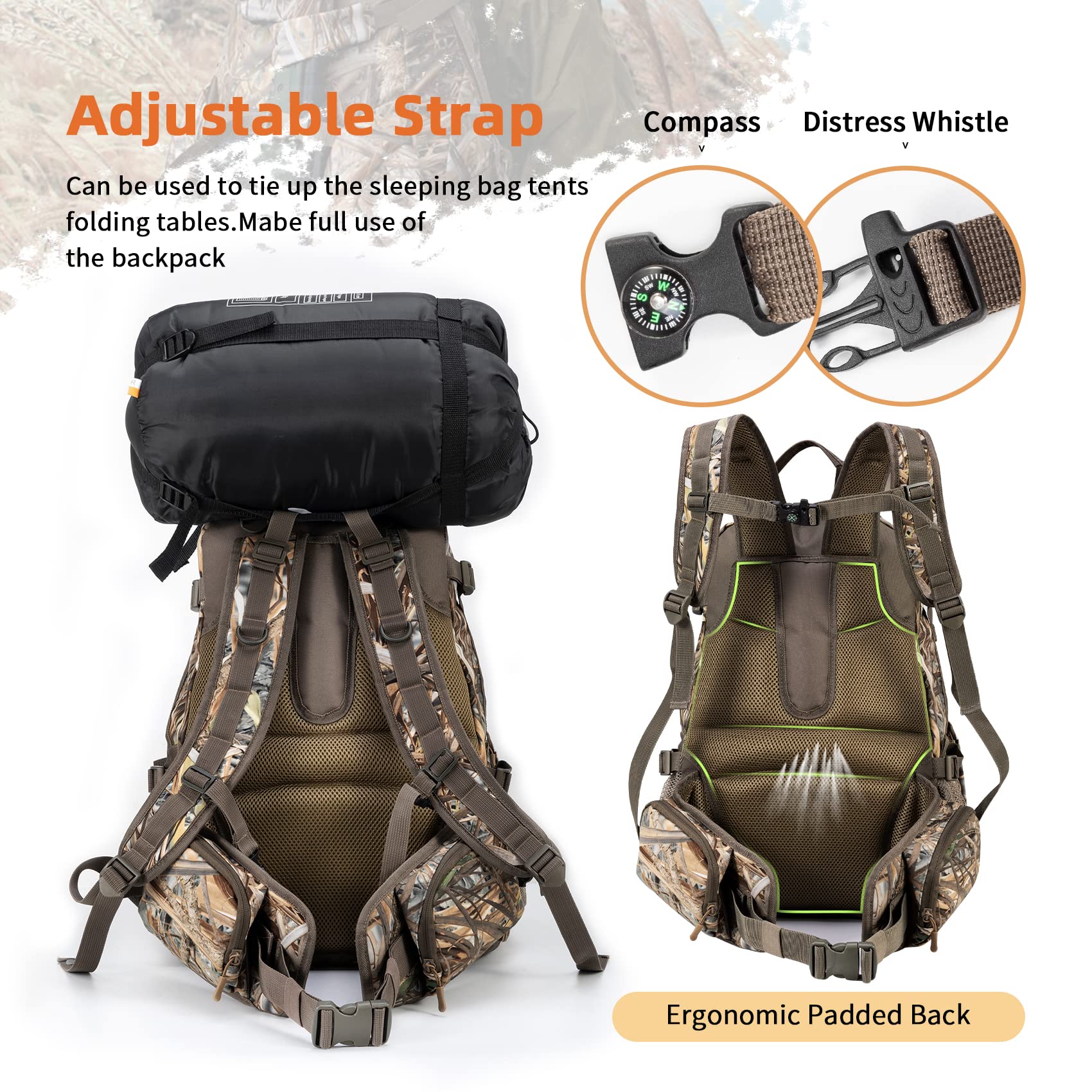 - Ergonomic Design:Expandable pocket to carry your gun or compound bow securely, and an adjustable torso system, you can comfortably carry your hunting essentials, padded shoulder straps, a padded cool mesh back, an adjustable sternum strap and a waist belt,decompressed,breathable and comfortable