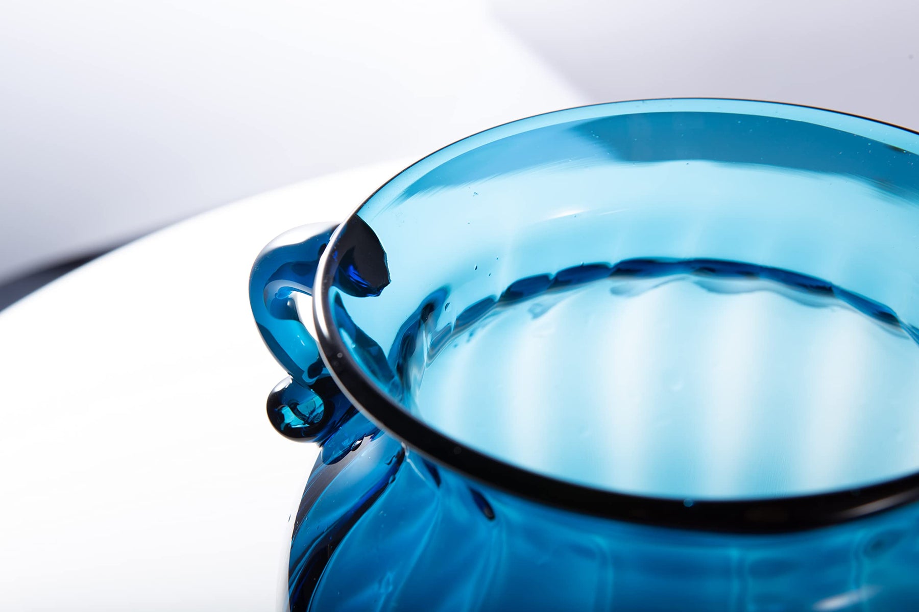 This vase comes from the blue of the sea, with two ears, hand blown.The mouth is open, which makes it easier to place more flowers; the bottom is thickened and widened, making it stronger and more stable.