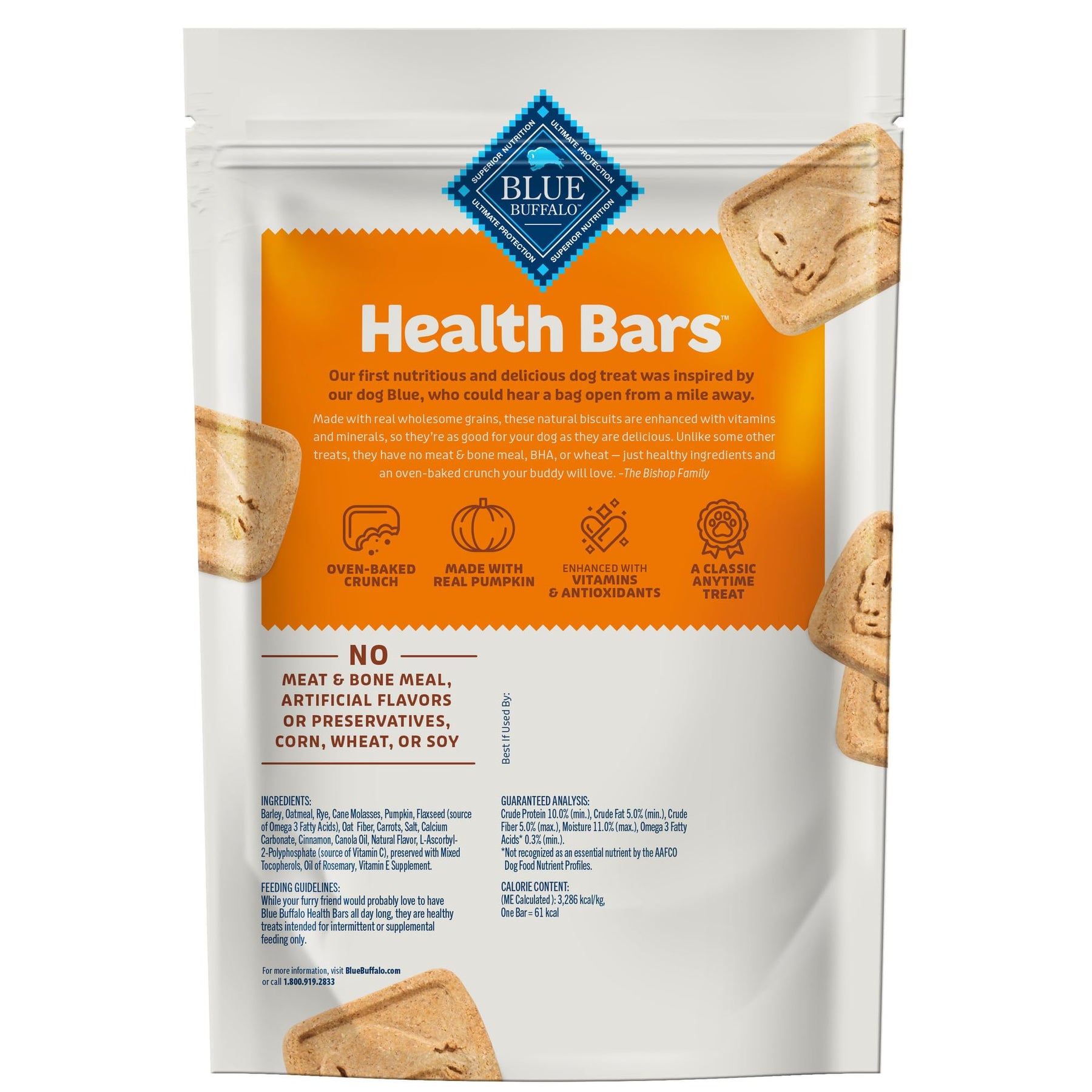 - Contains: One (1) 16-oz bag of BLUE Health Bars Natural Crunchy Dog Treats Biscuits, Pumpkin & Cinnamon