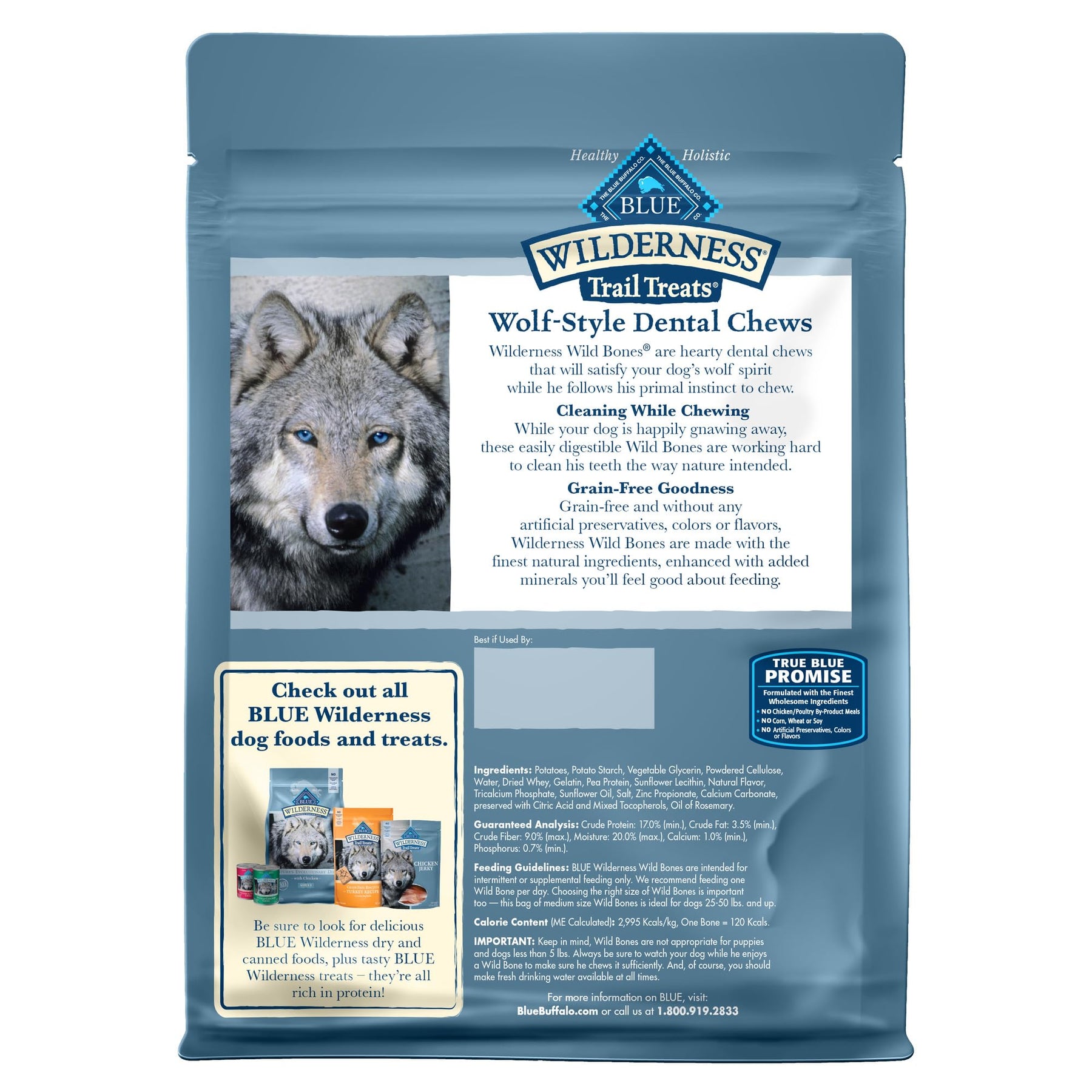 - Contains: One (1) 10-oz bag of BLUE Wilderness Trail Treats Wild Bones Medium Dental Chew Dog Treats