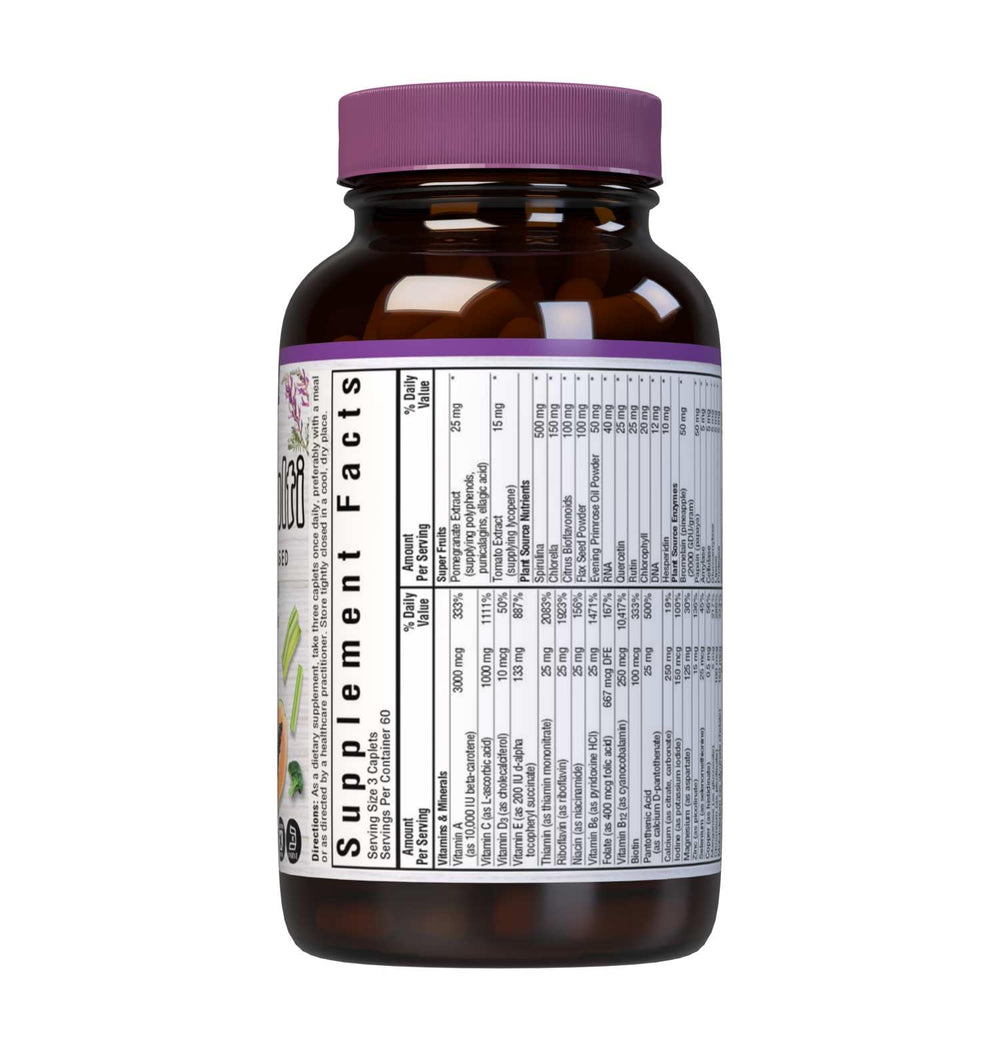 | ingredients | Vitamins & Minerals: Vitamin A (as 10,000 IU beta-carotene) 1500 mcg, Vitamin C (as L-ascorbic acid) 1000 mg, Vitamin D3 (as 400 IU cholecalciferol) 10 mcg, Vitamin E (as 200 IU d-alpha tocopheryl succinate) 133 mg, Vitamin B1 (as thiamin mononitrate) 25 mg, Vitamin B2 (as riboflavin) 25 mg, Vitamin B3 (niacinamide) 25 mg, Vitamin B6 (as pyridoxine HCl) 25 mg, Folate (as 400 mcg folic acid) 667 mcg DFE, Vitamin B12 (as cyanocobalamin) 250 mcg, Biotin 100 mcg, Pantothenic Acid (as calcium D-pantothenate) 25 mg, Calcium (as citrate, carbonate) 250 mg, Iodine (as potassium iodide) 150 mcg, Magnesium (as aspartate) 125 mg, Zinc (as picolinate) 15 mg, Selenium (as selenomethionine) 25 mcg, Copper (as histidinate) 500 mcg, Manganese (as gluconate) 5 mg, Chromium (as picolinate) 100 mcg, Molybdenum (as glycinate chelate) 150 mcg, Potassium (as citrate) 50 mg, Choline (as bitartrate) 10 mg). Inositol 25 mg, PABA (para-aminobenzoic acid) 25 mg, Organic Sprout Blend (from organic broccoli sprout, organic kale sprout) 100 mg. Super Fruit Antioxidants: Pomegranate Extract (supplying polyphenols, punicalagins, ellagic acid) 25 mg, Tomato Extract (supplying lycopene) 15 mg. Plant Source Nutrients: Spirulina 500 mg, Chlorella 150 mg, Citrus Bioflavonoids 100 mg, Flax Seed Powder 100 mg, Evening Primrose Oil Powder 50 mg, RNA 40 mg, Quercetin 25 mg, Rutin 25 mg, Chlorophyll 20 mg, DNA 12 mg, Hesperidin 10 mg. Plant Source Enzymes: Bromelain (from pineapple) (2000 GDU/gram) 50 mg, Papain (from papaya) 50 mg, Amylase 5 mg, Cellulase 5 mg, Glucoamylase 5 mg, Lipase 5 mg, Protease 5 mg. Herbs: Astragalus Root Extract 5 mg, Garlic Extract 5 mg, Ginger Root Extract 5 mg, Ginkgo Biloba Leaf Extract 5 mg, Horsetail Powder 5 mg, Panax Ginseng Root Extract 5 mg. Other Ingredients: Vegetable cellulose, stearic acid, vegetable magnesium stearate, vegetable glaze. Contains: Soybeans |